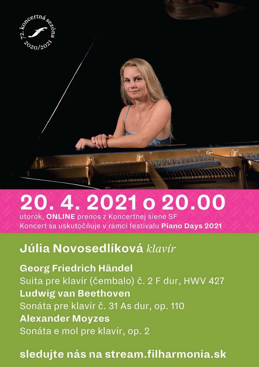 Občanské sdružení InMusic rozšiřuje slovenskou kulturní scénu o nový festival s názvem Piano Days, který potrvá až do 24. dubna. Pro první ročník pořadatelé zvolili online formu a úvodním koncertem bude zítra, v úterý 20. dubna, klavírní recitál Júlie Novosedlíkové. Přímý přenos ze sálu Slovenské filharmonie začne ve 20 hodin na stream.filharmonia.sk.