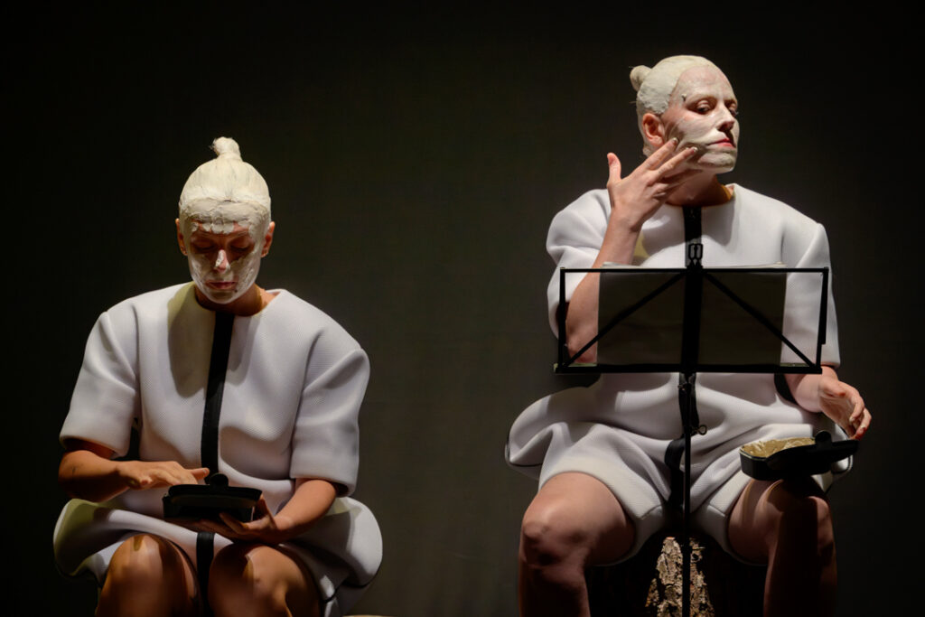 Všeobecne stavia Hora hudobný tok, takmer nepretržite prezentovaný inštrumentalistami, pomerne často na princípoch repetovania. Z tých potom vznikajú väčšie bloky, vzájomne rôzne kontrastné, dynamikou, tempom, štruktúrou. Melodika je pritom skôr prostá. Niekedy má parametre signálnych prejavov, netreba si ale predstavovať zvukomaľbu. Aj pri veľmi „súčasnom“ zvuku si hudba zachováva veľa archaického, až rituálneho. Inštrumentálna zložka na mňa rozhodne pôsobila dejotvorne, vytvárala okolo hlavných protagonistiek prostredie, kontext. Pochváliť tak treba výsadok Orchestru Berg: hrali Gabriela Barillová (husle), Štěpán Drtina (violoncello), Martin Debřička (saxofon), Štěpán Janoušek (trombón), Jakub Švejnar (bicie). Všetci pritom mali predpísané aj party pre hlas.