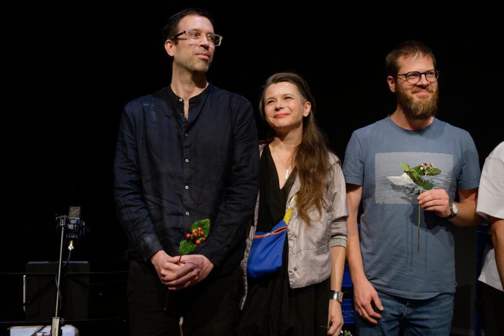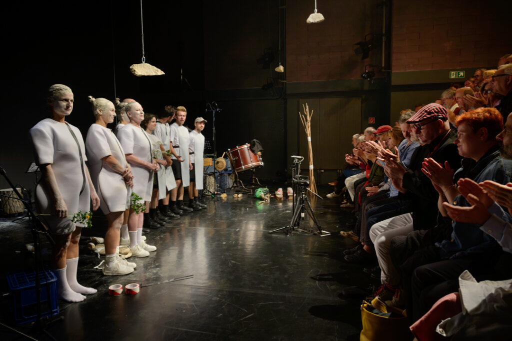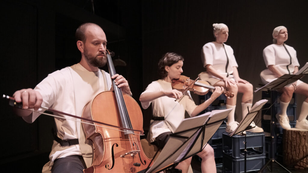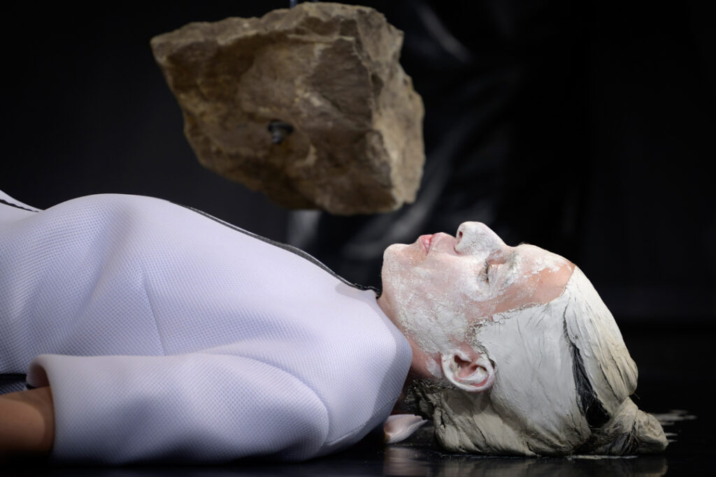 V polovici diela ešte šlo na základe textu rekonštruovať akýsi roztrieštený dej, alebo aspoň obrazy. Druhá polovica bola abstraktnejšia, oveľa viac postavená na pohybe (pohybová spolupráca Petra Hauerová) a neverbálnych hlasových prejavoch. Celkovo stavia réžia a scénografia (Petra Vlachynská) na už spomínanej estetike snu, možno vidiny, mýtu. Čím ďalej, tým sú obrysy rozostrenejšie a azda aj viac ponechané na vzájomných reakciách interpretiek a interpretov. Pôsobilo to na mňa, akoby sa ich „postavy“ ocitali v neznámych súvislostiach, učili sa v nich pohybovať sa… Ako dôležitý aspekt inscenácie som, aj vizuálne, vnímala kontrast prírody a civilizácie, zvieracieho a ľudského. Na scéne tak – mimoriadne efektne! – visia kamene, zároveň ale napríklad súbor sedí na plastových prepravkách. Takýchto prvkov potom pribúda. Atmosféru dotvárajú projekcie a light design (Pavel Havrda), ktorý sa tu stával dôležitým, v žiadnom prípade nie samoúčelným prostriedkom. Divadelná zložka priamo komunikuje s tou hudobnou, vlastne ju trochu nasleduje. Vzniká organický celok, účinný a veľavravný napriek tomu, že v ňom konkrétnych slov mnoho nepadne.