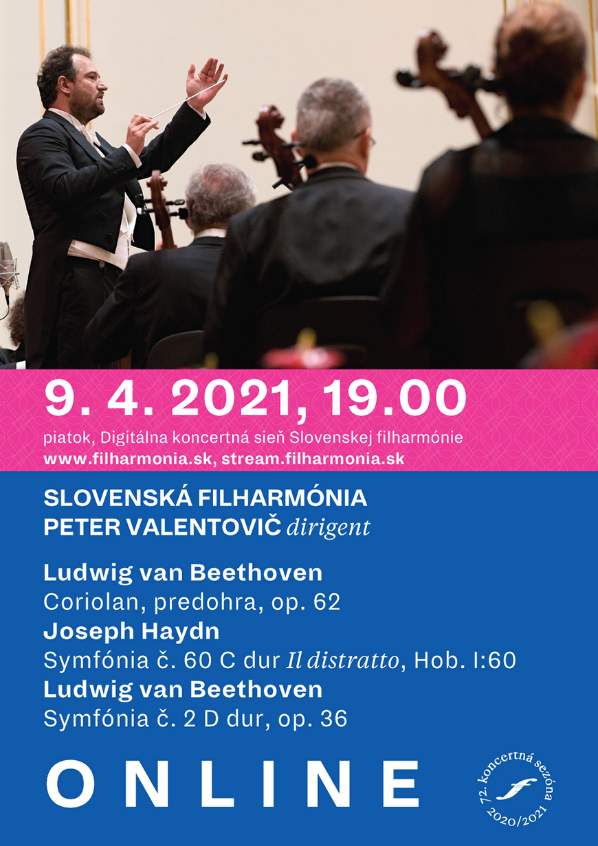 Slovenská filharmonie pokračuje v uvádění online koncertů bez publika. Na tento pátek 9. dubna přichystal přední slovenský orchestr díla dvou velikánů klasicismu – Josepha Haydna a Ludwiga van Beethovena, a to v nastudování dirigenta Petra Valentoviče. Přímý přenos bude k zhlédnutí na stream.filharmonia.sk od 19 hodin.