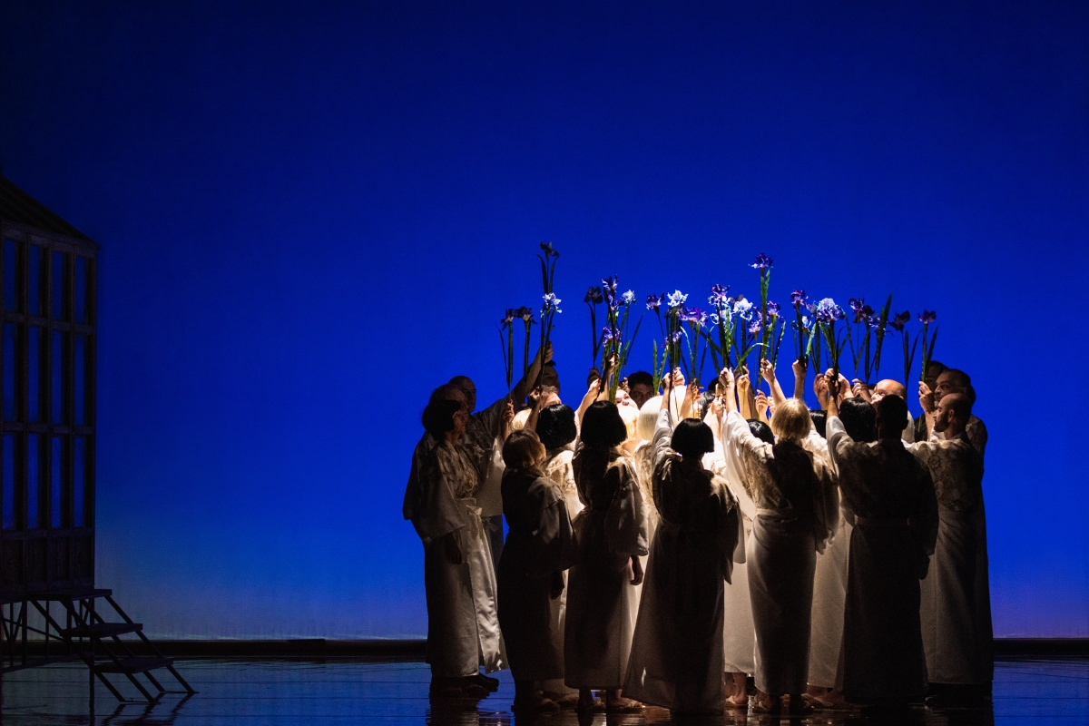 Režisér Tomáš Pilař vnáší do ztvárnění děje opery celou řadu nápadů. Například jedna ze závěrečných scén, kdy se na jevišti objevuje otec Iris a participující sbor má v rukách kapesní svítilny, je impozantní. Důležitou úlohu dokreslení děje sehrávají na pozadí promítané motivy /vzorce, veliké oči apod./, autorem videoartu je Petr Hloušek.