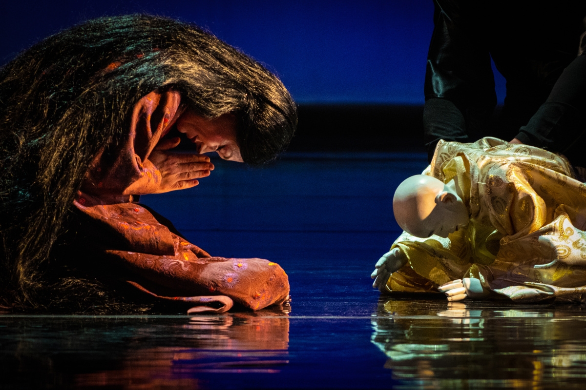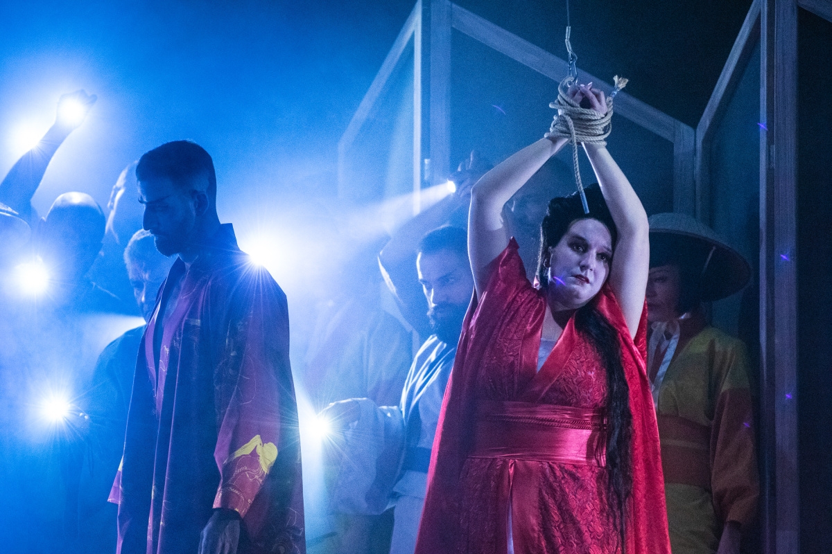 Scéna, jejímž autorem je Petr Vítek, je v každém ze třech dějství jiná. Vychází z minimalistické estetiky a využívá bohatou práci se světelnými efekty. V prvním dějství nalezneme na scéně japonskou zahradu, ve druhém, kdy jsme přeneseni do prostředí nevěstince, zaujme nesymetricky umístěný lustr složený jakoby ze samurajských mečů, bonsai na toaletním stolku vedle pohovky. Ve třetím dějství, kdy se na jevišti většinou pohybuje duch hlavní postavy, je scéna zcela prostá.