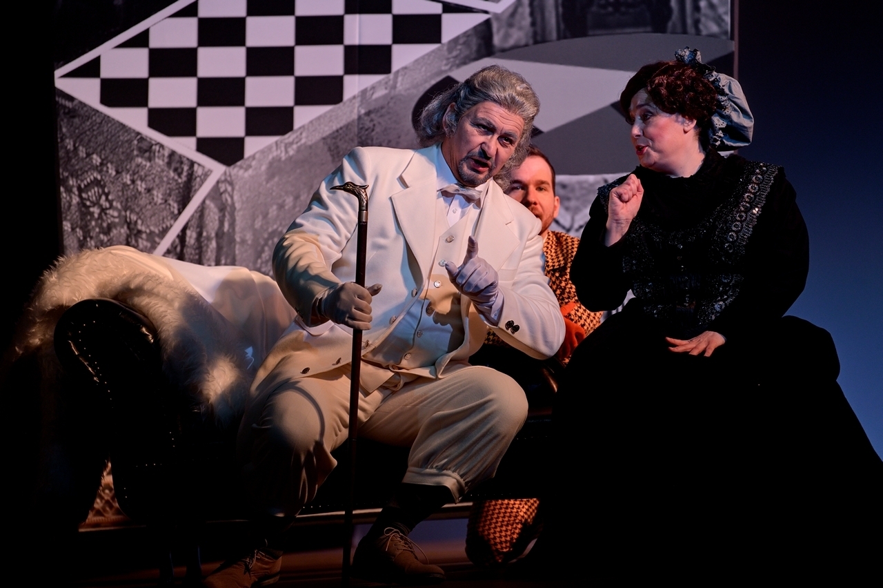 Inscenátorům se podařilo tentokrát obsadit role mezinárodním týmem, který byl pěvecky dobře vyvážený. Zinu zpívala Veronika Rovná, její hlas je silný a barevný, nese se prostorem bez potíží, bylo celkem zbytečné, že se snažila o forte, které působilo mnohdy ostře, zejména ve výškách. Její matku Marju Alexandrovnu představovala španělská pěvkyně Marta Infante, která vládne příjemným mezzosopránem, kterým se jí povedlo se šarmem přednést pěvecké číslo o Madeiře. Nastasju zpívala Irena Parlov z Chorvatska a s chutí vytvořila postavu zlomyslné a zahořklé stárnoucí ženské a barevným altem zvládala part s lehkostí. Roli Knížete si zahrál Pavol Kubáň ze Slovenska a přes své mládí si vychutnával roli senilního seladona a pohrával si příjemným barytonem s jemnými piany. Jeho podlého synovce Pavla si vychutnal Jorge Garza, pocházející z Mexika. Příjemný, dobře se nesoucí tenor a komediální schopnosti mu umožnily vytvořit plnokrevnou postavu intrikána a padoucha. Malou, ale podstatnou roli Barbary, nosící Zině zprávy od Fedi, ztvárnila Monika Jägerová a opilou, veselou postavu Sofii Petrovny s jedním pěveckým vstupem odvedla svěžím mezzosopránem Hana Dobešová. Archivářem s příjemným a pevným barytonem byl Roman Vlkovič. Panoptikum postav stylově doplnili Jiří Blažek a Jiří Dvořák jako téměř identická dvojčata v mimické roli sluhy Theophila.