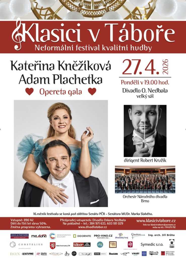 Stejnou či minimálně velmi podobnou příležitost jako brněnské publikum bude mít to přebývající ve městě Tábor. V tamějším Divadle Oskara Nedbala s projektem Opereta Gala vystoupí tuzemské pěvecké hvězdy, basbarytonista Adam Plachetka a sopranistka Kateřina Kněžíková. Stejně jako nedávno Brně je i 27. dubna v jihočeském městě doprovodí Orchestr Národního divadla Brno pod taktovkou Roberta Kružíka. Akci pořádá „neformální festival klasické hudby“ Klasici v Táboře.