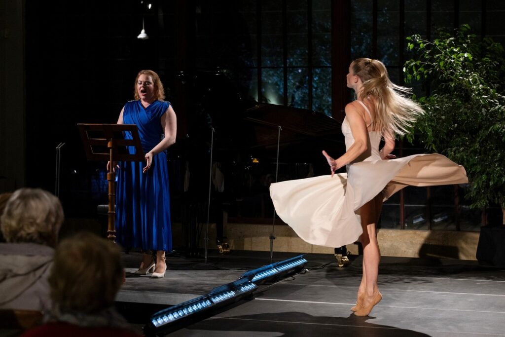 V prostoru Oranžérie je jen improvizované pódium, kam se pohodlně vešla zpěvačka a klavír, taneční kreace Kláry Jelínkové zde neměly téměř žádný prostor. Přesto si tanečnice poradila a dokázala využít všechny, i úzké prostory, které bylo možno najít, kolem stěn i za klavírem, byla stále ve hře, vždy se někde zjevila, jako všudypřítomná a nesmrtelná. Půvabná tanečnice zvládla provedení své role na výbornou, jen choreografie byla poněkud monotónní, stále se opakovalo několik figur, nepříliš propojených s významem zpívaného textu.