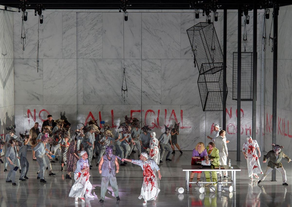 Partitura Animal farm obsahuje ne méně než 21 sólových rolí, které využívají celou škálu lidských hlasů a každá z nich má charakteristický individuální profil. Režisér Michieletto nezasadil událost na farmu, ale na jatka: „Postavy jsou tu, aby byly zabity. Jsou zavření v klecích a sní o svobodě. Být zvířetem zde znamená být otrokem, být masem, předmětem v rukou lidí.“ Michielettova inscenace vznikla v koprodukci s Nizozemskou národní operou a světovou premiéru viděl Amsterdam 4. března 2023. Po premiéře ve Vídni následují reprízy 2., 5., 7. a 10. března.