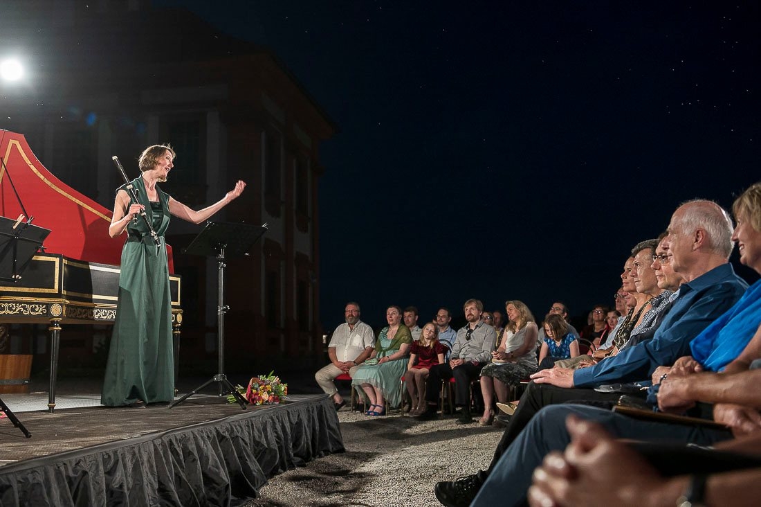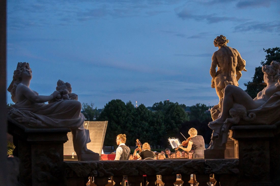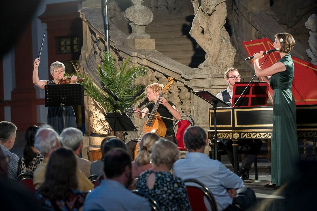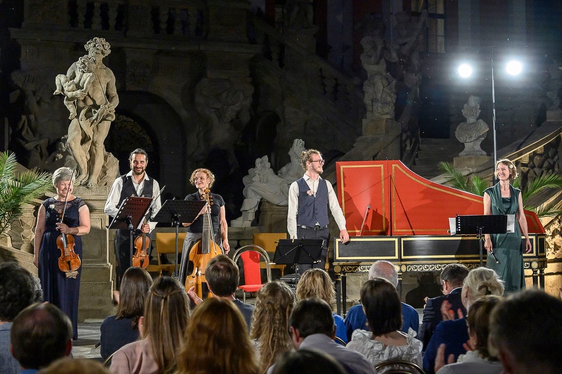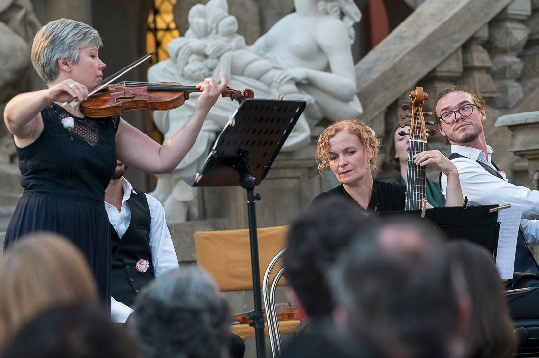 Úvod druhé části byl vskutku impozantní. S počínajícím šerem letního večera se z terasy nad dvouramenným schodištěm začaly linout zvuky květinového rondeau z opery Galantní Indiánové Jeana-Philippa Rameaua. Pohlazení po duši a detail, který potvrdil, že dramaturgie byla hlavní doménou celého večera. Po tomto entreé už přišel na řadu Pařížský kvartet č. 6 e moll. V sólových částech první věty na sebe houslistka Lenka Torgersen právem strhla veškerou pozornost. Její výkon byl zkrátka mimořádný. Pomyslné kolo se uzavřelo vybranými tanci již známého Jean-Fery Rebela. Tento dramaturgický záměr ale „překazilo“ publikum, které si svým potleskem vyžádalo přídavek. Přišel v podobě úpravy Tambourins z již zmíněné opery Les Indes Galantes od Jeana-Philippa Rameaua.