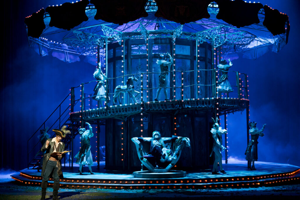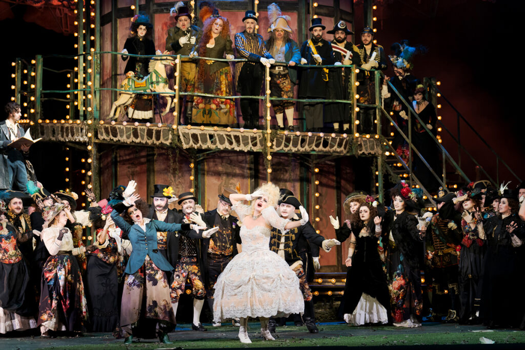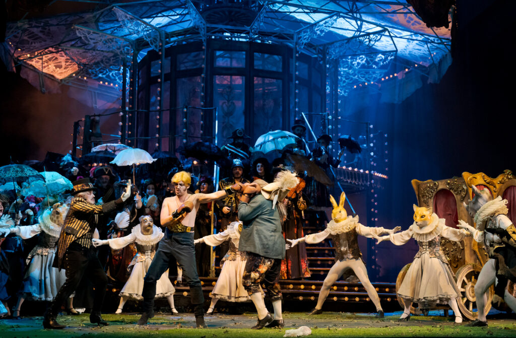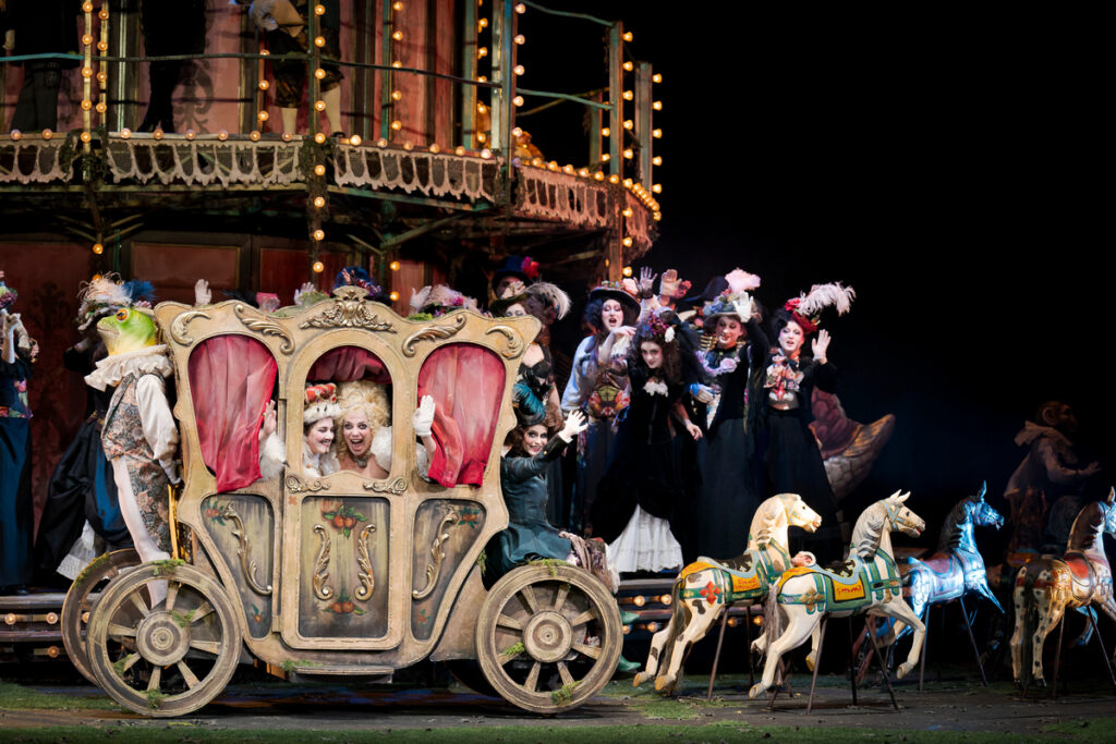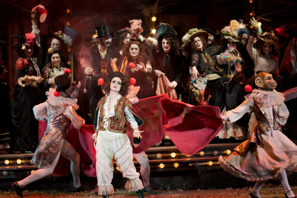 Režie se ujal Christian Thausing, který se vzkříšení operetní tradice věnuje od roku 2017. Podařilo se mu vytvořit plnokrevné operetní představení s nábojem a uměřenými, přesto účinnými operetními finesami. Pěvce, kteří zvládali své vypjaté pěvecké úlohy s lehkostí a nadhledem, dokázal vést k přesvědčivým hereckým akcím, aniž by jim chyběla nadsázka a pikantní nadhled. Vše se odehrávalo na jednotné scéně, obrovském kolotoči plném světel, která podle potřeby měnila svůj počet a intenzitu, a ještě byla barevně nasvěcována Sebastianem Alphonsem a Karlem Wiedemannem. Dvojitá točna dokázala rozpohybovat samostatně kolotoč i pás na jevišti, obě točny dokázaly jít samostatně, společně, nebo i proti sobě. To přispělo k dojmu velkého pohybu na jevišti. Autorem scény je Timo Dentler, opulentní a barevné kostýmy, inspirované folklorem i historií 16. století, vytvořila Okarina Peter. Tyto kostýmy ostře kontrastovaly s kostýmem Krále, který se po celou dobu pohyboval na jevišti v jakémsi dnešním „pyžamu“, ve zcela jednobarevném tričku s krátkými plátěnými kalhotami. Aby dostál „noblesy“, oblékl si král černé kalhoty se šlemi a na ně hermelínový plášť na šňůře a hermelínovou královskou korunu. To stačilo k vyjádření „výjimečnosti“ krále a jeho komičnosti.