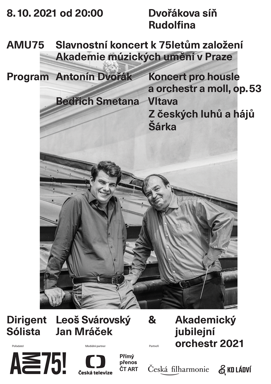 „Na koncertě vznikajícím péčí Hudební a taneční fakulty AMU (HAMU) v nastudování Leoše Svárovského, absolventa a pedagoga HAMU, vystoupí Akademický jubilejní orchestr 2021 tvořený ze současných studentů, pedagogů a absolventů HAMU,“ oznamují pořadatelé s tím, že zazní Koncert pro housle a orchestr a moll, op. 53 Antonína Dvořáka a výběr ze Smetanovy Mé vlasti – Vltava, Z českých luhů a hájů a Šárka. Jako sólista se představí houslista Jan Mráček, koncertní mistr České filharmonie a také student HAMU. Přímý přenos chystá Česká televize, a to na programu ČT art.