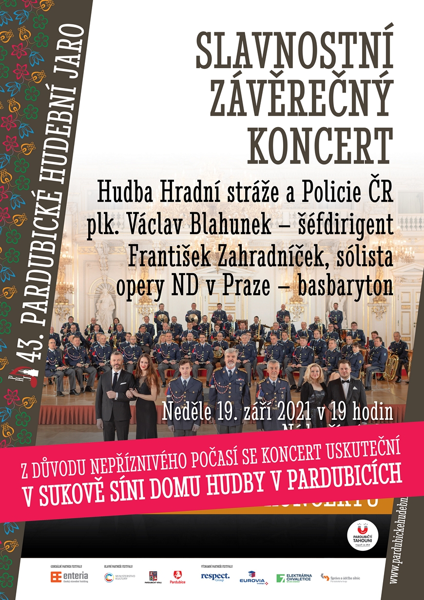 Původně závěrečný koncert festivalu Pardubické hudební jaro se bude konat tuto neděli 19. září v 19 hodin. Měl zaznít na nádvoří zámku v Pardubicích, ale z důvodu špatné předpovědi počasí se pořadatelé rozhodli přemístit akci do Domu hudby. Vzhledem k přesunutému termínu z jara došlo i ke změně programu a účinkujících. Ve skladbách Georga Friedricha Händela, Wolfganga Amadea Mozarta, Gioacchina Rossiniho, Bedřicha Smetany, Antonína Dvořáka a Jeana Sibelia bude účinkovat Hudba Hradní stráže a Policie ČR pod vedením svého šéfdirigenta plk. Václava Blahunka, sólistou večera bude basbarytonista František Zahradníček, člen opery Národního divadla v Praze.