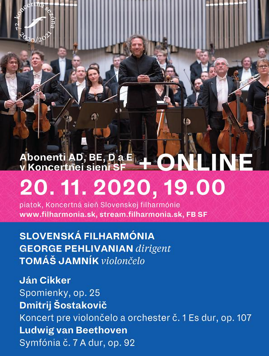 Slovenská filharmonie uvede páteční koncert 20. listopadu od 19 hodin opět s diváky, protože od pondělí slovenská vládní opatření umožňují obsadit padesát procent míst koncertního sálu. Lidé v publiku tak budou sedět ob jednu řadu. Sólistou večera bude náš významný violoncellista Tomáš Jamník, který se zhostí náročného partu Prvního violoncellového koncertu Dmitrije Šostakoviče. Bude to jeho debut u Slovenské filharmonie.