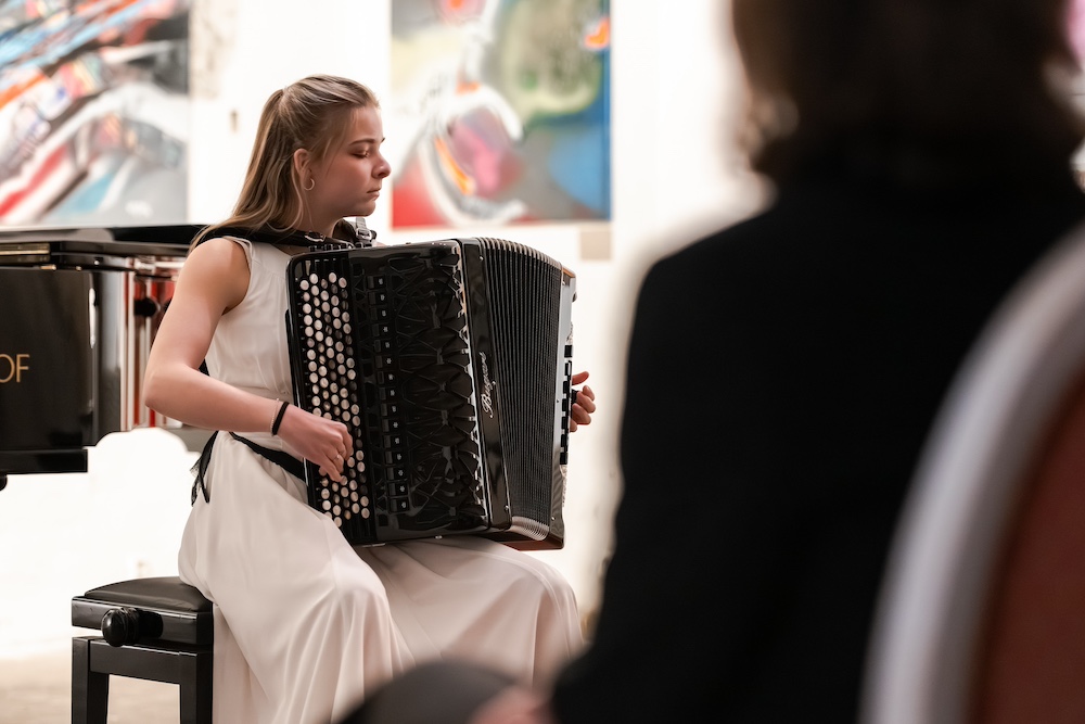 Ještě před pauzou, kterou může návštěvník hezky organicky využít k důkladnému zhlédnutí vystavených obrazů, se představila přední akordeonistka mladé generace Andrea Šulcová. Přednesla díla soudobých tvůrců, Menuetto Martina Lohseho a Kafkianu Jiřího Lukeše, a i v jejím případě se jednalo o skvělý, sebevědomý výkon, který přítomným atraktivně přiblížil možnosti nástroje – to zejména v případě Lukešova kusu, který ale považuju za kompozičně diskutabilní, protože z mého pohledu postrádá substanci a reálně funkční dramatický oblouk; slyším jen důkladnou znalost techniky hry na nástroj.