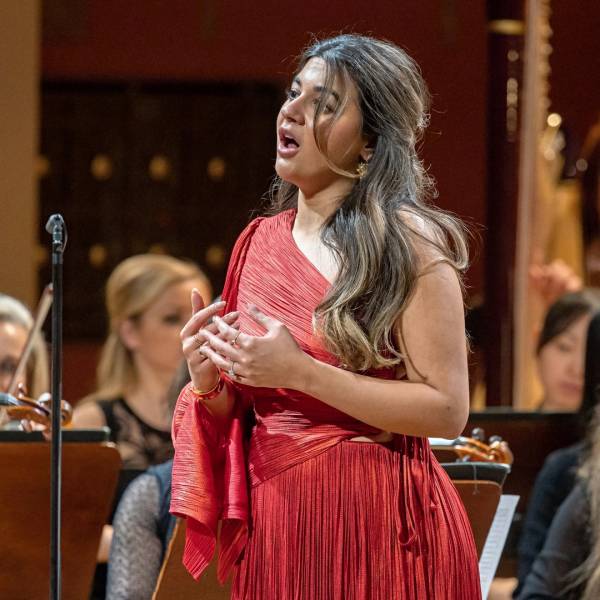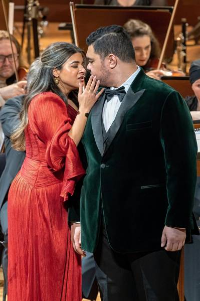 Amina Edris se představila v duetu O soave fanciulla z Pucciniho Bohémy se svým manželem a už v něm jsem si říkal, že na postavu Mimi má poněkud hutnější (bojím se napsat starší) hlas, než by u tak mladé pěvkyně bylo zdrávo. Přes orchestr se nenesl s absolutní jistotou, má poněkud méně alikvótů, které se projevují až v opravdu vysokých tónech. To jsem si utvrdil i v dalších jejích výstupech. I u ní však výrazně pomohla francouzština k vyššímu posazení hlasu, například v árii z Massenetovy opery Thaïs Dis mois que je suis belle. Společným pěveckým vrcholem obou manželů byl bez pochyby duet Toi! Vous! – Oui, c’est moi! z opery Manon téhož skladatele. Amina Edris velmi pěkně přednesla slavnou árii Lauretty O mio babbino caro z Pucciniho opery Gianni Schicchi. Tu zazpívala namísto v programu uvedené Eleniny árie Mercè, dilette amiche ze Sicilských nešpor Giuseppe Verdiho. Z toho usuzuji, že sopranistka možná nebyla zcela ve své špičkové kondici, proto se těším, až ji v budoucnu uslyším znovu.