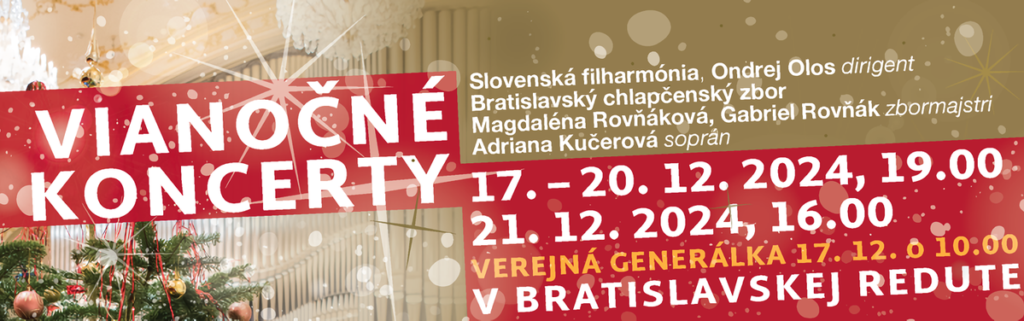 „Vianočné sviatky predstavujú v kolobehu života akýsi pevný bod, do ktorého každý ďalší rok, plný nových neistôt, prekvapení a výziev opäť s istotou vyústi. Je to obdobie, kedy sa opäť snažíme nájsť si viac času na svojich blízkych, na oddych, na to, čo nám prináša radosť a pokoj. (…) Preto i tradičné koledy a obľúbené skladby od autorov komponujúcich naprieč štýlmi majú svoje neoddeliteľné miesto počas vianočných sviatkov,“ přibližuje ideu vánočních koncertu bratislavská produkce. Bratislavský chlapecký sbor pod vedením dirigentky, zakladatelky a manažerky Magdaleny Rovňákové vystupuje doma i v zahraničí a nahrává také pro televizi a film; nyní se představí také v Koncertní síni Slovenské filharmonie. Hlavní sólistkou večera bude Adriana Kučerová, která nedávno ztvárnila hlavní roli Lišky Bystroušky v opeře Slovenského národního divadla. Sérii vánočních koncertů povede Ondrej Olos, dirigent opery Národního divadla v Brně. Znít budou díla celé řady skladatelů velké šíře stylů, např. autoři Charpentier, Händel, Franck, Čajkovskij, Mozart, ale i Čekovská. Podrobnosti ke zvolenému repertoáru zde.