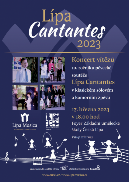 Letošní jubilejní desátý ročník pěvecké soutěže Lípa Cantantes, kterou vyhlašuje Mezinárodní hudební festival Lípa Musica a Základní umělecká škola Česká Lípa, se bude konat v pátek 17. března v prostorách ZUŠ Česká Lípa. Děti a mladiství mezi sedmi a pětadvaceti let věku z Libereckého a Ústeckého kraje, kteří se věnují klasickému sólovému a komornímu zpěvu na základních uměleckých školách, budou moci i letos porovnat své pěvecké schopnosti a dovednosti v sólové či komorním zpěvu před odbornou porotou. Její předsedkyní bude v letošním roce nově sopranistka Anna Hlavenková, která je vedoucí oddělení zpěvu na Konzervatoři Teplice. Vyhlášení vítězů společně s veřejně přístupným koncertem se uskuteční také 17. března ve foyeru ZUŠ Česká Lípa.
