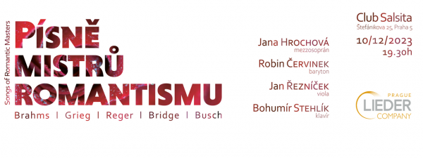 Posledním koncertem letošního roku se rozhodl spolek Lieder Company Prague vzdát hold romantickým autorům. V případě tří z nich navíc připomene jejich letošní jubilea – písně Johannesa Brahmse, Edvarda Hagerupa Griega a Maxe Regera budou doplněny dalšími písněmi méně uváděných pozdně romantických autorů Adolfa Busche a Franka Bridge. Vystoupí mezzosopranistka Jana Hrochová, sólistka Národního divadla v Brně, barytonista Robin Červinek, loňský absolutní vítěz Mezinárodní pěvecké soutěže Antonína Dvořáka v Karlových Varech, a pedagogové JAMU, violista Jan Řezníček a klavírista Bohumír Stehlík. Koncert se uskuteční v neděli 10. prosince v prostorách smíchovského Clubu Salsita.