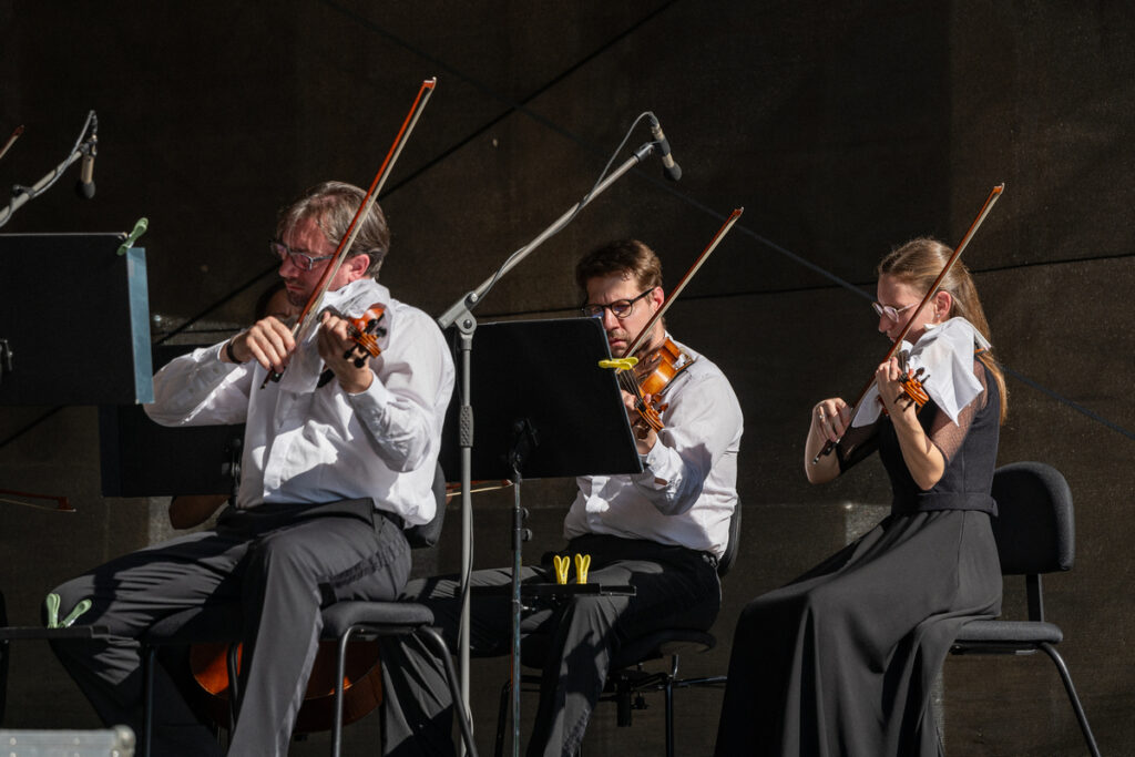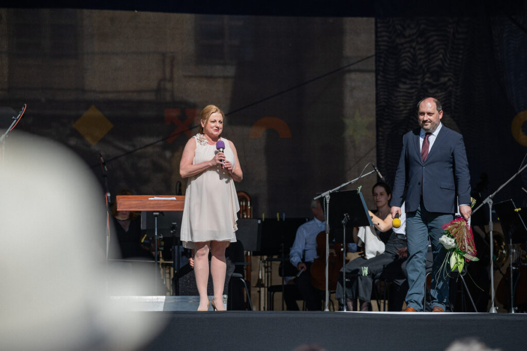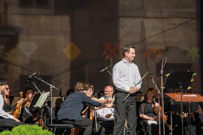 Koncert zahájil Slavnostní pochod, op. 54 Antonína Dvořáka. Z prostorových důvodů musela Plzeňská filharmonie volit na pódiu vklíněném mezi obě zámecká křídla menší nástrojové obsazení. Po Dvořákově kompozici navozující slavnostní atmosféru následovala v Plzni dosud málo uváděná Maďarská pastorální fantazie pro flétnu a orchestr, op. 26, lvovského rodáka Alberta Franze Dopplera (1821–1883), který se s mladším bratrem Karlem (1825–1900) výrazně uplatnil v hudebním životě někdejší rakousko-uherské monarchie. Oba bratři prosluli jako vynikající flétnisté, kapelníci, pedagogové a zruční skladatelé. Albert Franz Doppler, autor mnoha skladeb pro flétnu, měl v Budapešti vedle zakladatele maďarské národní hudby Ference Erkela zásadní podíl na vzniku prvního maďarského symfonického tělesa. Ve svých kompozicích často uplatňoval prvky polské, maďarské, ruské, ale i orientální hudby. Virtuózně pojatá fantazie pro flétnu výrazně využívá idiomy maďarského folklóru, počínaje zvuky pastýřských píšťal, v úvodu evokující melancholii maďarské puszty, přes taneční rytmy novouherského stylu až k efektním chromatickým pasážím, jimiž se vyznačovaly dobové virtuózní skladby určené sólovým nástrojům. Skladba původně psaná pro flétnu a klavír zazněla v autorově orchestraci. Sólového partu se s technickým nadhledem, kultivovaným tónem a smyslem pro výrazové odstínění jednotlivých částí ujal první flétnista Plzeňské filharmonie Jakub Klögner.