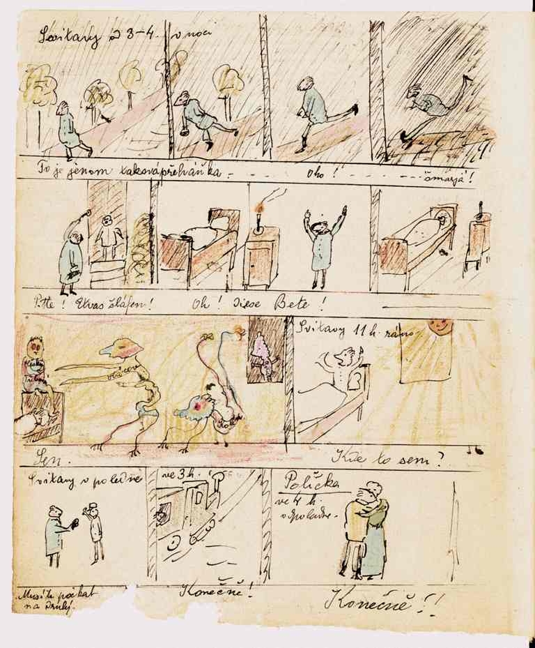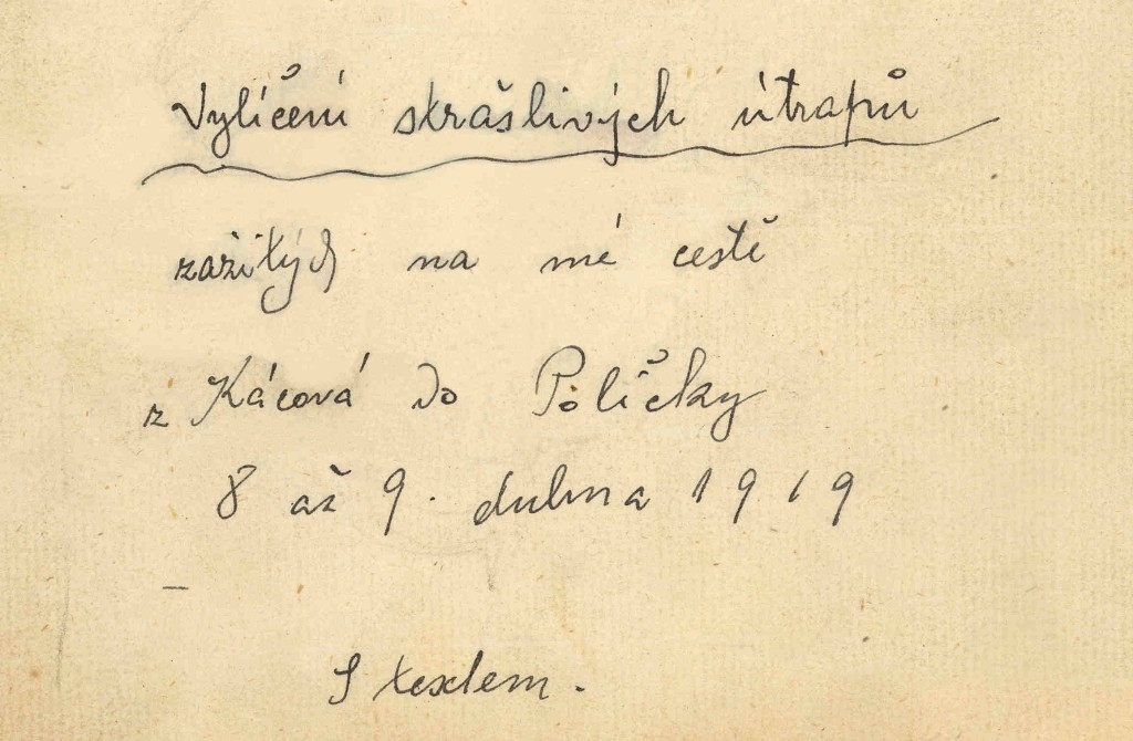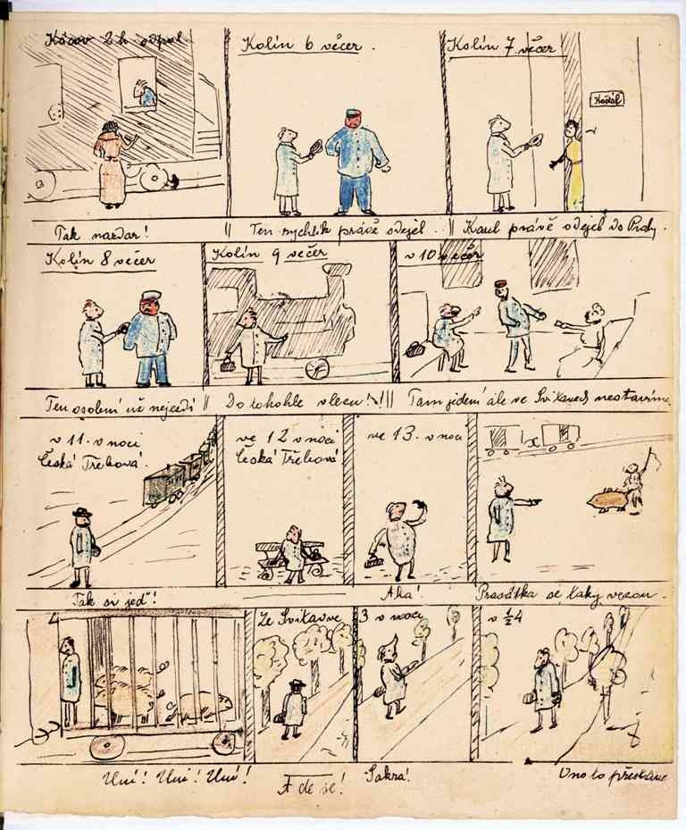 Cestě z Kácova do Poličky Martinů věnoval dvě a půl stránky. Nejprve ji uvedl krátkým slovním vpiskem: „Vylíčení strašlivých útrapů zažitých na mé cestě z Kácova do Poličky 8. až 9. dubna 1919. S textem“, za nímž následovaly dvě stránky kreslené reportáže z poněkud nevydařené cesty. Celkem 26 na sebe navazujících kresbiček je vedených jako komiks, což je dozajista rarita, když uvážíme, že v době jejich vzniku se komiks v českém prostředí jen nesměle prosazoval (pravděpodobně prvním českým autorem komiksu je Josef Lada, jenž v Humoristických listech v letech 1908-1916 vydával své Nezbedné komiksy). A co že se vlastně Bohuslavu Martinů „strašlivého“ přihodilo?