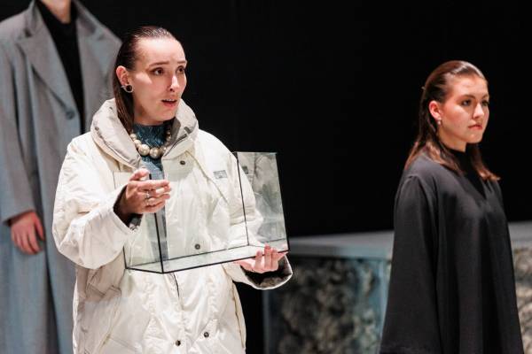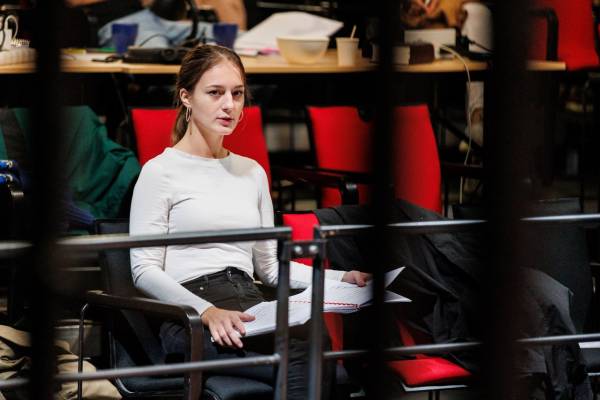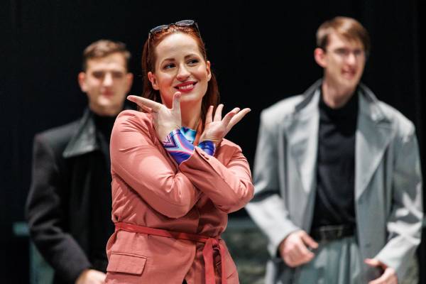 Markéta: Hlavní postavy to měly náročné na nalezení vlastního výrazu. Ale určitě je to náročnější pro ansámbl, jak zmiňoval Marek. Mají spoustu vět, které musí umět nazpaměť, musí to říct nahlas, musí se rytmicky trefit a každý k tomu všemu tvoří vlastní roli. Cílem bylo, aby to působilo jako ruch, tam si někdo s někým povídá, tam někomu přijde zpráva. Říkala jsem někomu, ať to řekne víc nahlas, aby to bylo slyšet. Odpověděl mi, že si počítá. Je to pro ně asi i svazující.