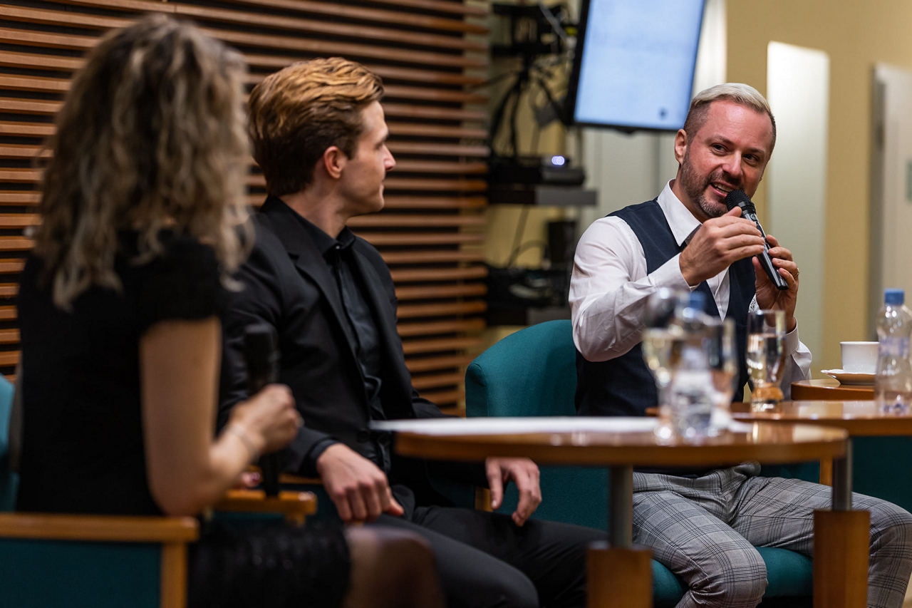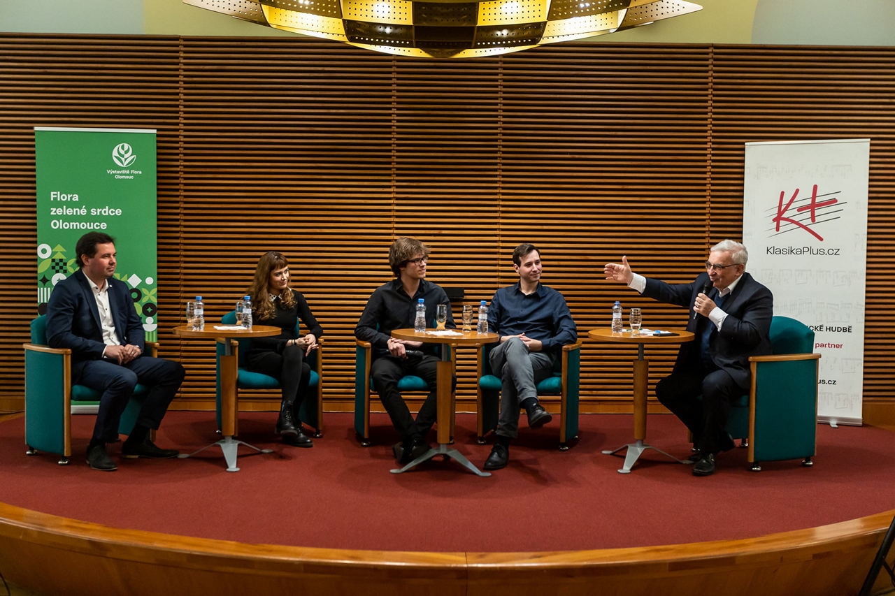 Ze dvou možností – pořádat besedy buď před koncertem, či po něm – zvolilo vedení MFO první variantu. A maje bohaté zkušenosti s oběma modely, považuji to za správné. Každé řešení má své klady i zápory. Zdá se mi však, že těch druhých je potenciálně víc u takzvaných aftertalks. Jednak začínají pro řadu diváků dost pozdě, protože účastní-li se jich kromě sólistů i dirigent, což je obvyklé, přece jen chvíli trvá, než ze sebe v šatně shodí zpocený oděv a usebere se k povídání. Především ovšem není nikdy dopředu jasné, zda se interpretům vystoupení povedlo, či ne. Mají-li pocit, že nikoli, mohou si frustraci klidně vybít při rozhovoru, což působí nepěkně. A naopak, pokud se vznáší v oblacích, bývá jejich řeč k nezastavení… Zajisté ani beseda před koncertem není bez rizika. Umělci, pokud na ni kývnou, logicky vyžadují určitý čas, aby se mohli na svůj jevištní výkon soustředit. Což je ale v Olomouci vyřešeno tím, že debata začíná hodinu před vystoupením a končí přesně po třiceti minutách.