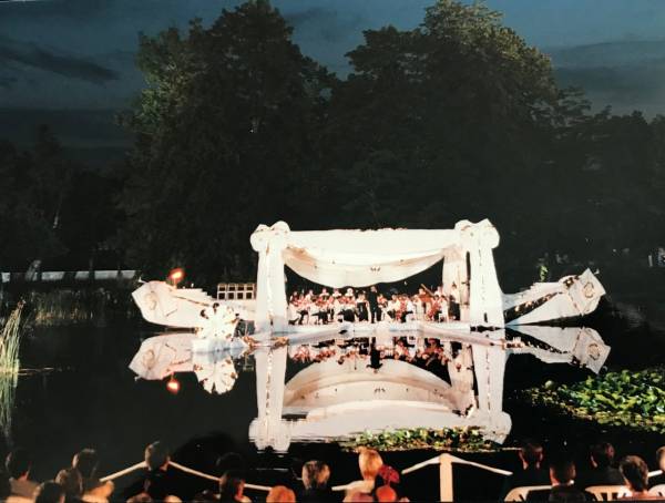 Už tehdy se pro to muselo – ve spolupráci s ředitelem Hradu a zámku Český Krumlov Pavlem Slavkem, který jako oddaný památkář na vše dohlížel ostřížím zrakem – vykonat mnohé. Vybraným místem se stalo rozlehlé jezírko v nejzápadnější části anglického parku zámecké zahrady. Víceméně ve svém středu totiž nabízí ostrůvek dost velký na to, aby se na něj vměstnal přiměřeně obsazený orchestr a obě zmíněná díla provedl. Jenže. Porost na něm se tehdy musel prosekat málem jako v džungli a na hladině jezírka bylo nutné uvolnit v záplavě leknínů uličku dost širokou na to, aby jí před koncertem proplula od břehu na ostrůvek lodička. Jan Bonaventura totiž trval na představě, že přenos – ale i zážitek pro pár stovek diváků kolem jezírka – začne tím, že pramice veslovaná pohlednou místní dívčinou přiveze na místo hudební produkce dirigenta, kterým byl tehdy Nizozemec Andrew Mogrelia. A také do kamery zblízka hovořícího moderátora, shodou okolností autora těchto řádků, který vestoje musel důvěřovat umu slečny u pádla i klidné hladině bez náhlého poryvu větru.