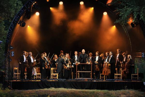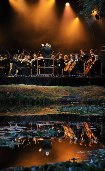 Toto intermezzo si letos Zahajovací večer jedenatřicátého Mezinárodního hudebního festivalu odpustil, neboť televizní kamery nebyly přítomny a efekt by bez nich zjevně ztratil na kouzlu. Nepochybně však i tentokrát bylo nutné provést na jezírku i kolem něj řadu úprav. Nachystat pódium na ostrůvku, zastřešit jej pohlednou mušlí se světly podobnými lampionům. Iluzi barokní slavnosti pomáhalo dotvořit i rafinované osvětlení celého prostoru, zároveň působivé a nevtíravé. A divákovi, který měl chuť se při poslechu hudby rozhlédnout, ani zde českokrumlovský genius loci nechyběl. Jen kousek za masivní zdí zámeckého parku šlo tušit romantiku jak někdejšího statku Kvítkův dvůr, tak okolních luk a lesů, zvolna se nořících do tmy. Koncert v podání Jihočeské filharmonie, řízené Vojtěchem Spurným, totiž úmyslně začal až v devět večer, aby jej soumrak postupně zabalil do tajuplnosti.