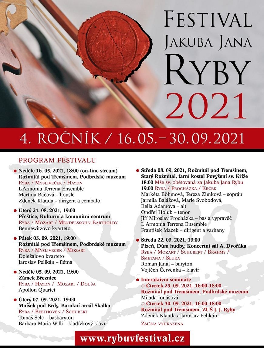 Kulturní a komunitní centrum v Přešticích bude v úterý hostit smyčcové Bennewitzovo kvarteto, které přednese hudbu Rybovu, Mozartovu a Mendelssohnovu. Doležalovo kvarteto s flétnistou Jaroslavem Pelikánem vystoupí v Podbrdském muzeu v Rožmitále pod Třemšínem, a sice v pátek 3. září. Opět zaznějí skladby Jakuba Jana Ryby, dále Josefa Myslivečka a Wolfganga Amadea Mozarta. V neděli 5. září zahraje na zámku Březnice Apollon Quartet. Kromě Rybovy hudby soubor do programu zařadil i skladby Mozarta, Haydna a současného skladatele Eduarda Douši.