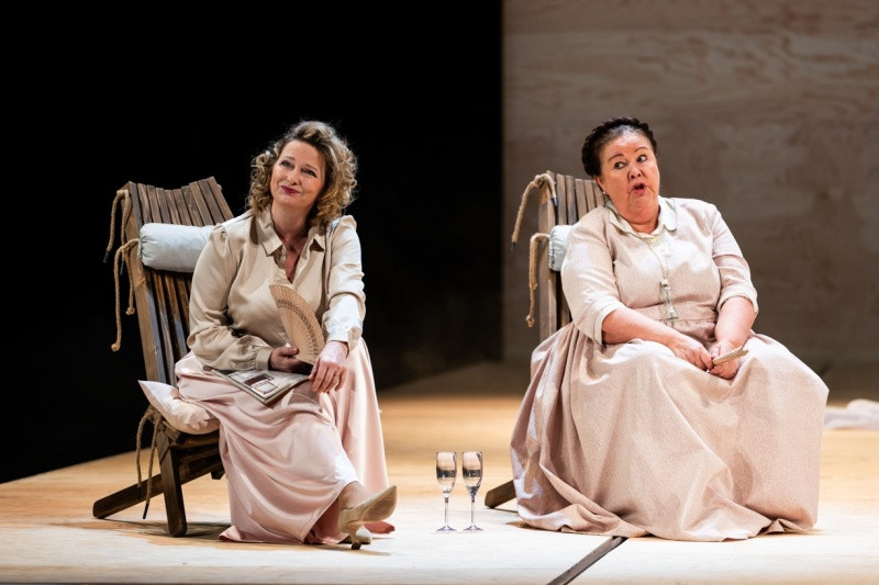 Po několika taktech předehry se zvedá opona, vidíme mírně zvýšené pódium zaujímající téměř celou jevištní plochu. Je ohraničeno rampou z ledkových světel, na konci pódia se do výšky asi tří metrů tyčí stěna z dřevěných desek. V popředí vlevo sedí na lehátkách dvě ženy, jedna v dlouhých bílých šatech, druhá v jakémsi velmi volném domácím oděvu. Ovívají se vějíři, je tedy horký letní den. Divák možná trochu zapochybuje, zda se opravdu bude hrát opera, zda nepřišel na představení některé z Čechovových her, zvláště poté, co se na jeviště přišourá starý sluha, evokující postavu sluhy Firse z Višňového sadu. Ale to už začíná úvodní pěvecký kvartet. Dámy na lehátkách jsou statkářka Larina a chůva Filipjevna. Po počáteční nejistotě, v jaké že době se děj odehrává (dlouhé bílé šaty Lariny?), se už divák zorientuje: jsme ve 20. století či snad dokonce v současnosti, protože další postava, Olga, má velmi odvážnou, téměř průhlednou minisukni. Její sestra Taťána naproti tomu černé šaty, střihem připomínající uniformu chovanek klášterní školy.