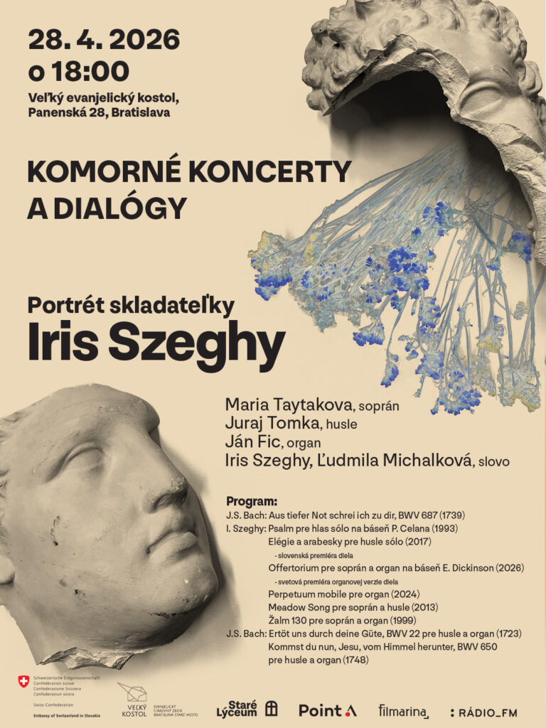 V úterý 28. dubna se ve Velkém evangelickém kostele na Panenské ulici v Bratislavě uskuteční další večer z cyklu Komorní koncerty a dialogy, tentokrát zaměřený na tvorbu komponistky Iris Szeghy. Dramaturgie večera staví na principu dialogu, jak hudebního, tak slovního, a vedle koncertu nabídne i reflexi skladatelčina uměleckého přístupu.
