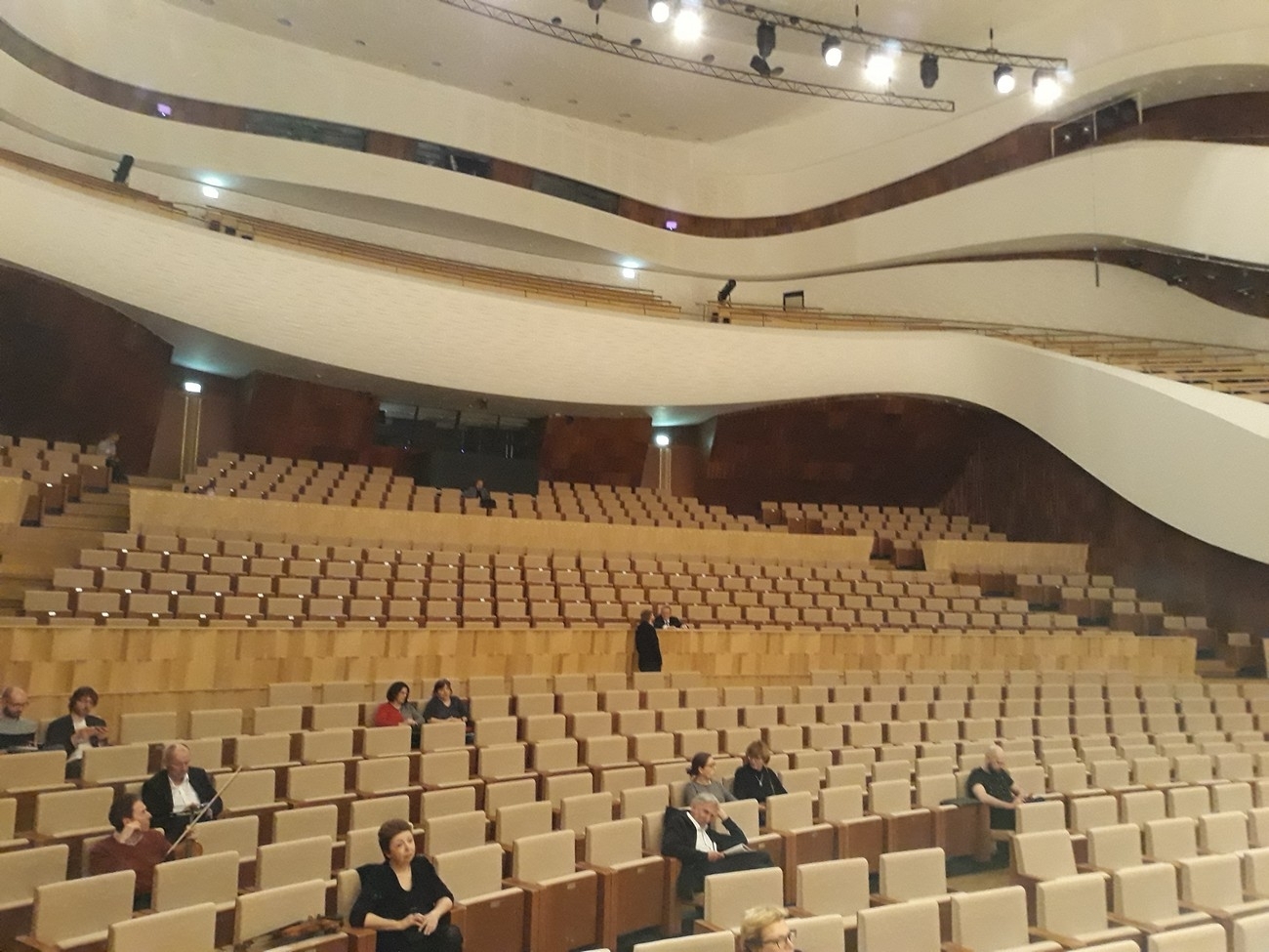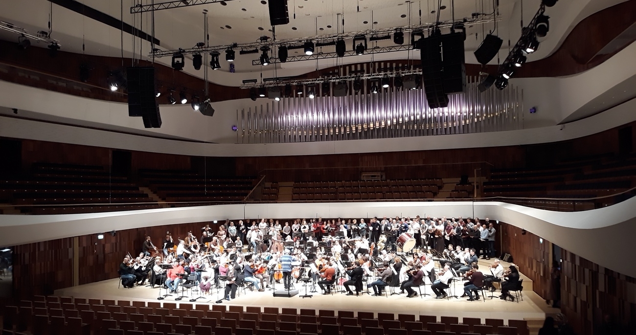 Sál je už na pohled velmi elegantní a jeho akustické podmínky jsou opravdu výjimečné. Během koncertu se vám samozřejmě příležitost vyslechnout si provedení z několika různých míst obvykle nenaskytne, generální zkouška to však umožňuje; z hlediska posluchačského je prakticky jedno, zda sedíte těsně pod pódiem, v nejvyšší řadě, či ve střední části u stěny – zvuky se sálem nesou s nenucenou lehkostí, aniž by se slévaly. Polohovací možnosti sálu si však vybírají svou daň – každá řada sedadel je upevněna na jednom zakřiveném panelu. Jelikož se pod ní nenachází pevná konstrukce, nýbrž sada různých táhel a zdviží, stačí u jedné stěny dupnout a s posluchačem na druhé straně příslušného schodu se zatřese sedadlo. Stejně tak výhod elevace pódia si sbor mnoho neužil – rozmístění na pódiu vůči pěveckém tělesu není úplně fér. Zatímco orchestr se pohodlně rozprostřel po celém „přízemí“ i prvních dvou schodech, sbor se tísní z větší části na tom třetím. Pouze někteří pánové v basu a některé dámy v sopránu mohou na krajích postoupit o stupínek níže, v tom případě jim ale ve výhledu překážejí kontrabasy. Přestože se vedení sboru snaží nevhodné postavení nějak řešit, už to tak zůstane.
