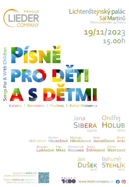 Listopadový koncert Lieder Company Prague nesoucí název Písně pro děti a s dětmi je v mnoha ohledech netypický. Nejenže vystoupí etablovaní sólisté – sopranistka Jana Sibera a tenorista Ondřej Holub –, ale především devět dětských sólistů, které vybrala v červnu porota ve vypsaném konkurzu. U klavíru se v průběhu koncertu budou střídat klavíristé Jan Dušek a Bohumír Stehlík, v závěrečné skladbě pak zahrají společně. Koncert se koná 19. listopadu od patnácti hodin v Sále Martinů na pražské HAMU.