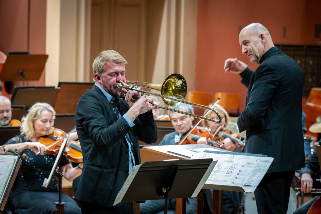 Petr Wajsar svěřil začátek své kompozice pozounistovi Štěpánu Janouškovi, který jistým tónem narýsoval intervalově rozpínavé, i když relativně krátké melodické téma. Po následném zapojení celého orchestru, z něhož jako jiskry vyletovaly smyčcové skřípoty a dechové plochy v bolestně zúžených souzvukových sazbách, se sólový trombon začal více soustředit na témbrové obrušování a uvolněné rozvíjení původního melodického tvaru, do čehož se zcela automaticky v konvenčně modernistických skřecích a glissandových turbulencích empaticky vcítilo i celé orchestrální těleso. Následkem toho vznikla poslechově zábavná a striktně sonorně zacílená strukturní hra nadaná četnými dynamickými zlomy a vpády. Další věta měla oproti svému aleatornímu předchůdci tonálně zakotvenější formu.
