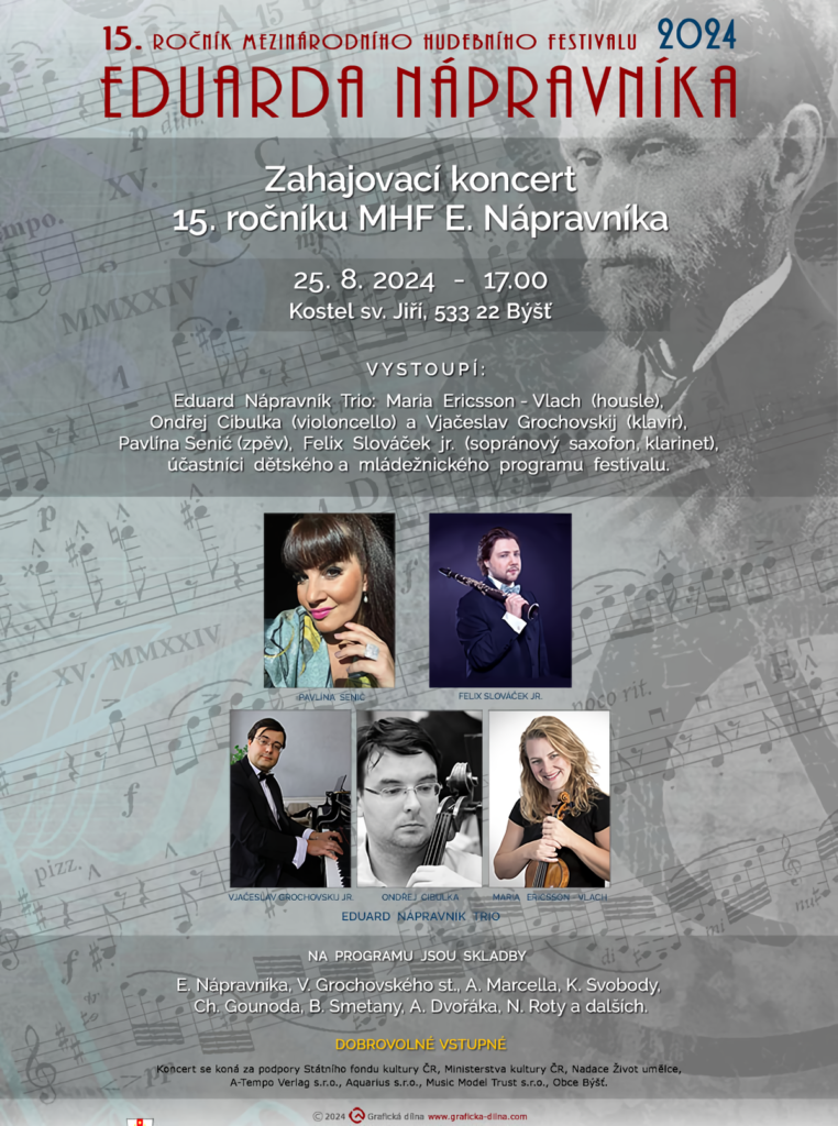 Mezinárodní hudební festival Eduarda Nápravníka se letos koná popatnácté. Zahajovací koncert se uskuteční 25. srpna v rodišti významného skladatele a dirigenta, tedy v Býšti v okrese Pardubice. Vystoupí Eduard Nápravník Trio ve složení Maria Erikson-Vlach (housle), Ondřej Cibulka (violoncello) a Vjačeslav Grochovskij (klavír), dále Pavlína Senić (soprán), Felix Slováček mladší (sopránsaxofon, klarinet) a účastníci mládežnického festivalového programu.