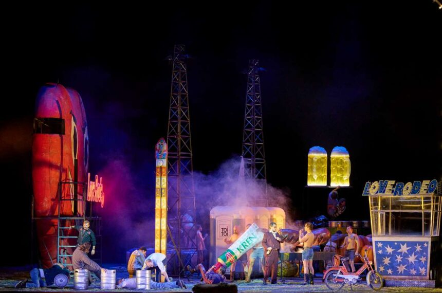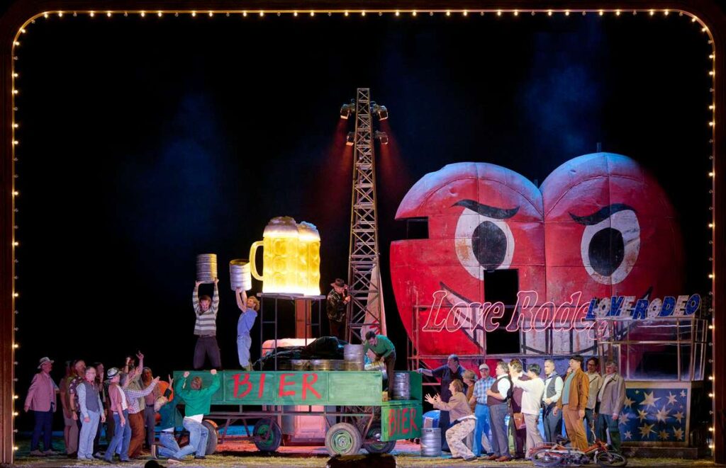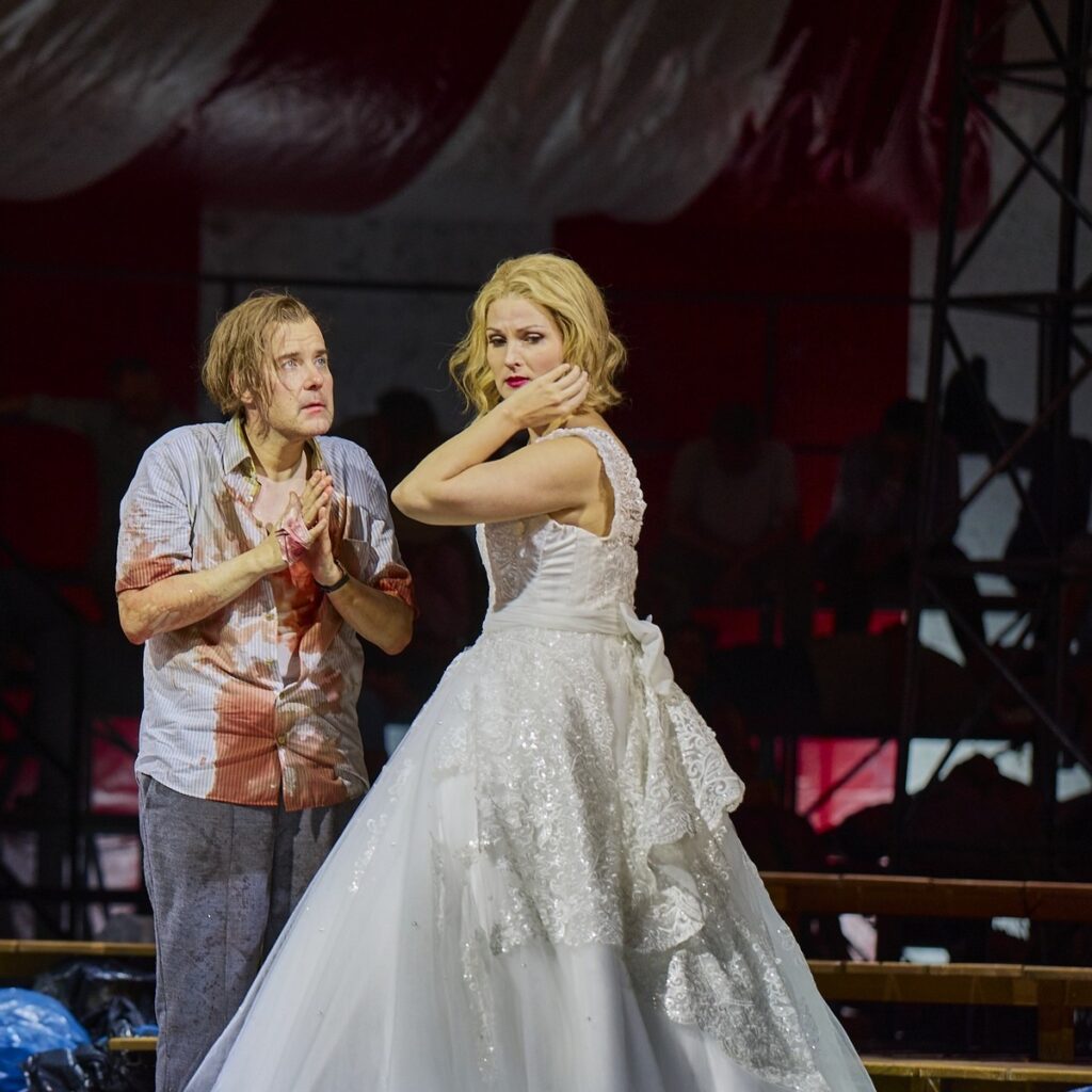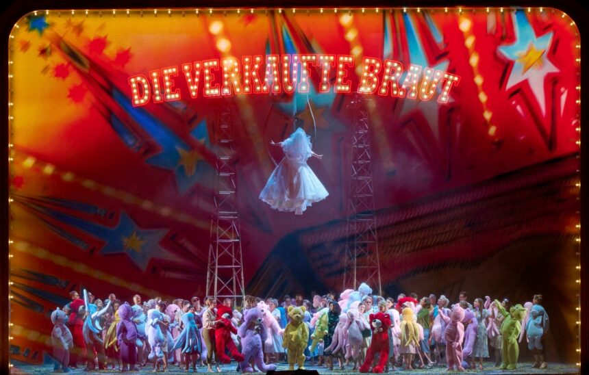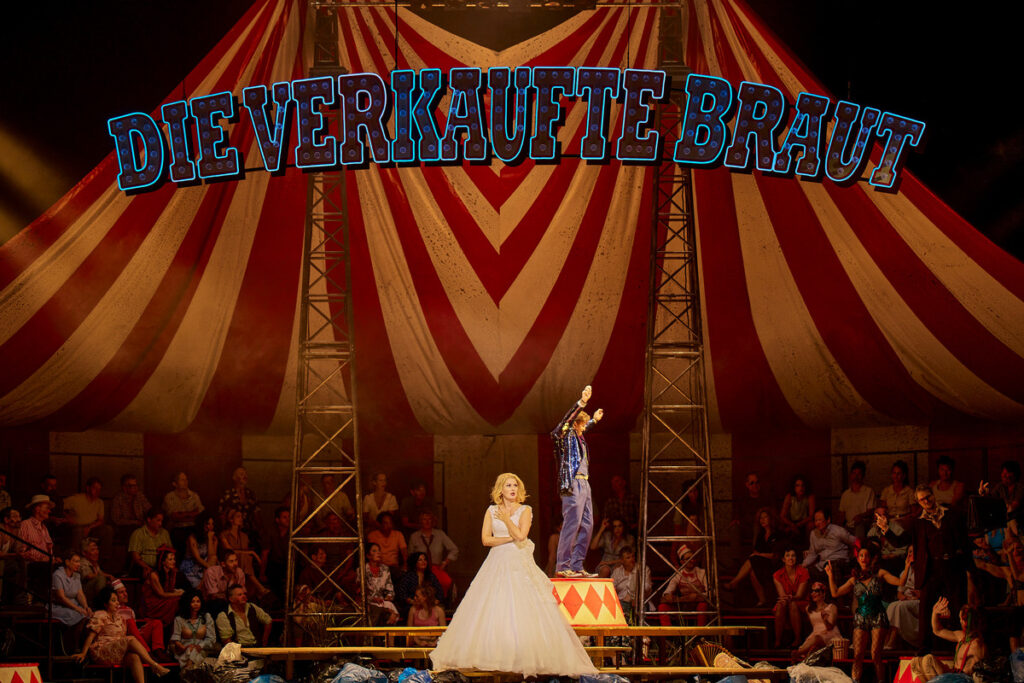 Prodaná nevěsta Bedřicha Smetany je titul pro nás ikonický, vážíme si ho jako rodinného stříbra a kolem způsobů jeho inscenování se ještě stále vedou vášnivé spory. Sice se už upustilo od představy jihočeské vesnice v krojích, přesto představy mladých režisérů jsou publikem i kritikou těžko vstřebávány. Pohled našich sousedů Rakušanů, se kterými jsme byli v době vzniku Smetanovy opery spojeni do jednoho státu, je poněkud překvapivý. Dokonce jsou slyšet i názory, že „Prodaná nevěsta je naše! Přece ji napsal Sabina německy a Smetana taky komunikoval v němčině. Tak proč by se nemohla zpívat německy?“ Pravdou je, že díky německému textu Maxe Broda se otevřel pro Prodanou nevěstu svět (stejně jako pro Janáčkovu Jenůfu) a Gustav Mahler ji dostal i do Metropolitní opery. Nicméně dnešní inscenátoři dospěli k názoru, že květnatá romantická němčina je přežitek a že je potřeba text zmodernizovat. Za novým textem stojí Susanne Felicitas Wolf a Sergio Morabito, dramaturg Vídeňské státní opery. Vyšli ze všech předchozích německých textů a vytvořili text moderní. I když při pozorném sledování textů na předkladatelském zařízení v hledišti jsem nabyla přesvědčení, že z osmdesáti procent jde o doslovný překlad námi používaného českého textu. Zůstala i jména postav: Mařenka, Jeník a Vašek i Kecal. Komparace s hudbou se zdařila a text je přehledný a sdělný. Jistě k tomu přispěl svým dílem i dirigent představení Tomáš Hanus.