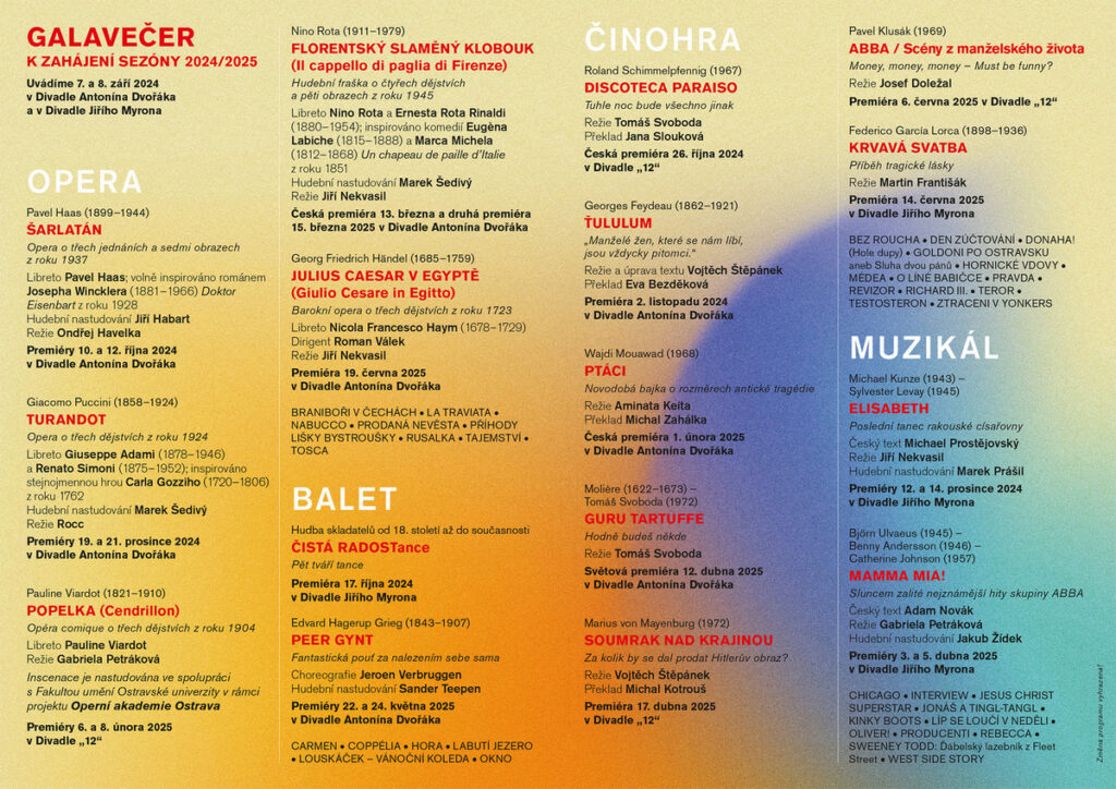 Muzikálový soubor ostravské scény nově uvede tituly Elisabeth Michaela Kunzeho a Sylvestera Levaye a Mamma mia! s hity populární skupiny ABBA. Ostravskou nabídku pro sezónu 2024/2025 doplní sedm nových činoherních titulů. Jako doprovodný program nebudou v Ostravě chybět ani výtvarné výstavy. V Galerii Opera v Divadle Jiřího Myrona pořadatelé představí instalace ve spolupráci s Institutem tvůrčí fotografie při Slezské univerzitě. V ostravské divadelní nabídce se objeví i řada koncertů, a to v rámci bienále hudby 20. a 21. století Ostravské dny, ale také v rámci komorní řady zasazené do sálu Myronova divadla, který bude v příští sezóně pojmenován po scénografovi, malíři a ilustrátorovi Vladimíru Kristinovi.