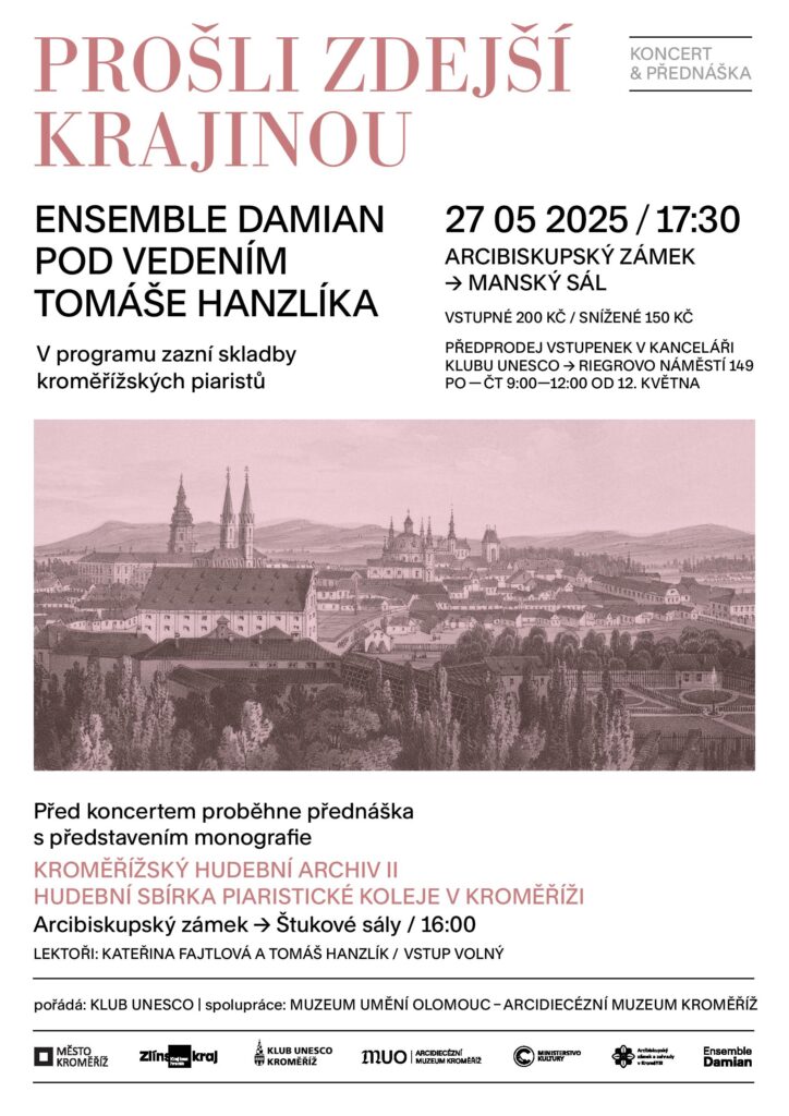 Arcibiskupský zámek v Kroměříži přivítá v úterý 27. května Ensemble Damian vedený Tomášem Hanzlíkem. Od půl šesté večer bude v tamním Manském sále uveden program Prošli zdejší krajinou složený ze skladeb kroměřížských piaristů. Koncertu bude předcházet přednáška s představením tematické monografie.