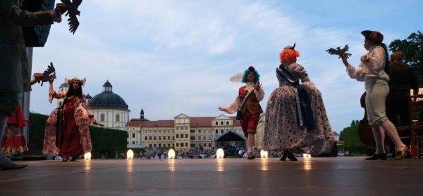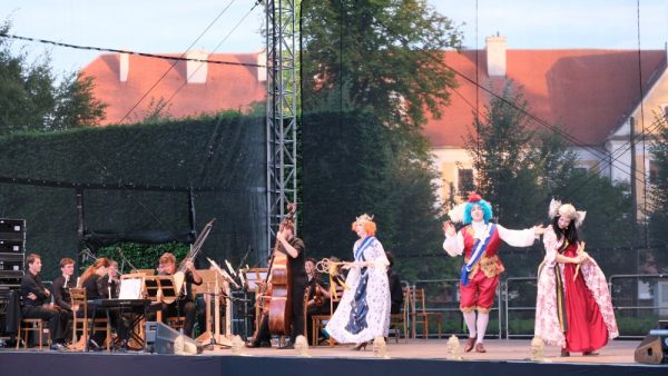 Hudba v baroku neměla tak významné společenské postavení jako v době moderní. Dnes je posluchač zvyklý se v potemnělém sále pohroužit do světa tónů a relaxovat či rozjímat. V baroku byla hudba užitkovou záležitostí, zvukovou kulisou ke společenským konverzacím, hrátkám či flirtování a především k hostinám. Umělci se museli hodně snažit, aby zaujali publikum. Velkými gesty, okázalou výpravou i efektní hrou či zpěvem. Barokní divadlo bylo plné technických efektů a deus ex machina, snášející se z nebe, vyřešil jakoukoli zápletku. V Jaroměřicích nejspíš tehdy takové efekty neměli (kdoví…) a neměli je ani toto pondělí. Zcela jistě. Navíc se měl Festival Petra Dvorského původně konat na zámeckém nádvoří – posun termínu stavebních prací vrátil akce tam, kde se původně realizovaly, do zámecké zahrady. To umocnilo atmosféru, ale vítr, který si pohrával s připravovanými dekoracemi, neumožnil nachystat zamýšlenou scénickou podobu. Na pódiu se tedy v levém rohu usadil orchestr a účinkující se museli přizpůsobit a provést operu víceméně koncertně, sice v kostýmech a s barokní gestikou, ale na prázdném jevišti. Zástupce pořádající agentury Ars koncert, paní Lenka Šimečková, situaci před akcí vysvětlila a aby akcentovala ducha události, vybídla přítomné, aby se vžili do atmosféry baroka a během téměř čtyřhodinové opery se pokusili chovat jako tehdejší publikum. Tedy se projít, jít si pro občerstvení ke stánku a v klidu během opery i konzumovat. Jen málokdo to vzal vážně, přece jen se dnešní publikum, alespoň na akcích klasické hudby, chová raději ukázněně.