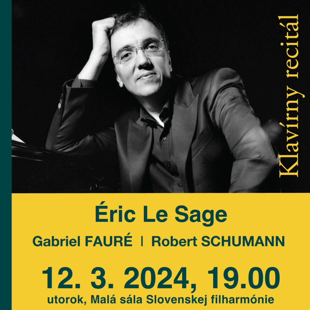 Na úvod koncertu Érica Le Sageho 12. března zazní Nokturno č. 6 Des dur, op. 63 Gabriela Faurého, které patří k jeho nejvýznamnějším dílům v rámci celé klavírní tvorby. Skladbu zkomponoval v létě 1894 a premiéra zazněla ve stejném roce. Následovat bude Schumannův klavírní cyklus Davidsbündlertänze, op. 6 (Tance Davidových spojenců) – osmnáct charakteristických skladeb různých nálad, které skladatel zkomponoval v roce 1837. Po nich se Éric Le Sage vrátí ke klavírní tvorbě Gabriela Faurého zařazením jeho skladby Téma a variace, op. 73. Patří k autorovým nejhranějším klavírním skladbám vůbec. Téma a variace věnoval své žákyni, přítelkyni, zpěvačce a klavíristce Thérèse Roger. Premiéra díla se konala 10. prosince 1896 v londýnské St. James Hall v podání klavíristy Léona Delafosseho. Závěr recitálu patří Robertu Schumannovi a jeho cyklu Karneval, op. 9.