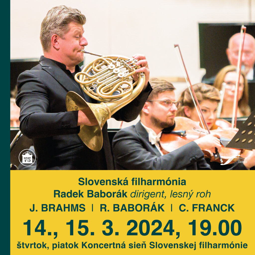 Radek Baborák se v Bratislavě představí poprvé v trojúloze sólisty, dirigenta a autora uváděného díla. Fenomenální hráč do svých osmnácti let sbíral ocenění na domácích i zahraničních interpretačních soutěžích, např. jako 12letý se stal vítězem Concertina Praga, v patnácti letch získal třetí cenu na Pražském jaru. Jako 18letý se stal nejmladším prvním hornistou České filharmonie, po dalších dvou letech se stal členem orchestru Berlínských filharmoniků. V jeho nastudování 14. a 15. března zazní tři díla – Akademická slavnostní předehra Johannesa Brahmse, L’Orangerie, burleska pro lesní roh a smyčce Radka Baboráka a Symfonie d moll Belgičana Césara Francka.