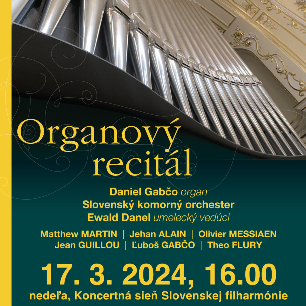 Sólistou odpoledního varhanního recitálu 17. března bude Daniel Gabčo, hlavní varhaník v katedrále sv. Martina v Bratislavě, kde je kromě aktivní umělecké činnosti a tvorby hudební dramaturgie činný také v oblasti směřování liturgické hudby na Slovensku. Některá díla z programu koncertu uvede umělec v doprovodu Slovenského komorního orchestru s uměleckým vedoucím Ewaldem Danelem. V premiéře zazní Sinfonia pro varhany a smyčcový orchestr Ľuboše Gabča, varhaníkova bratra. Program bude pestrou mozaikou děl pro varhany od více autorů – Thea Fluryho, Oliviera Messiaena, Jeana Guilloa, Jehana Alaina a dalších.