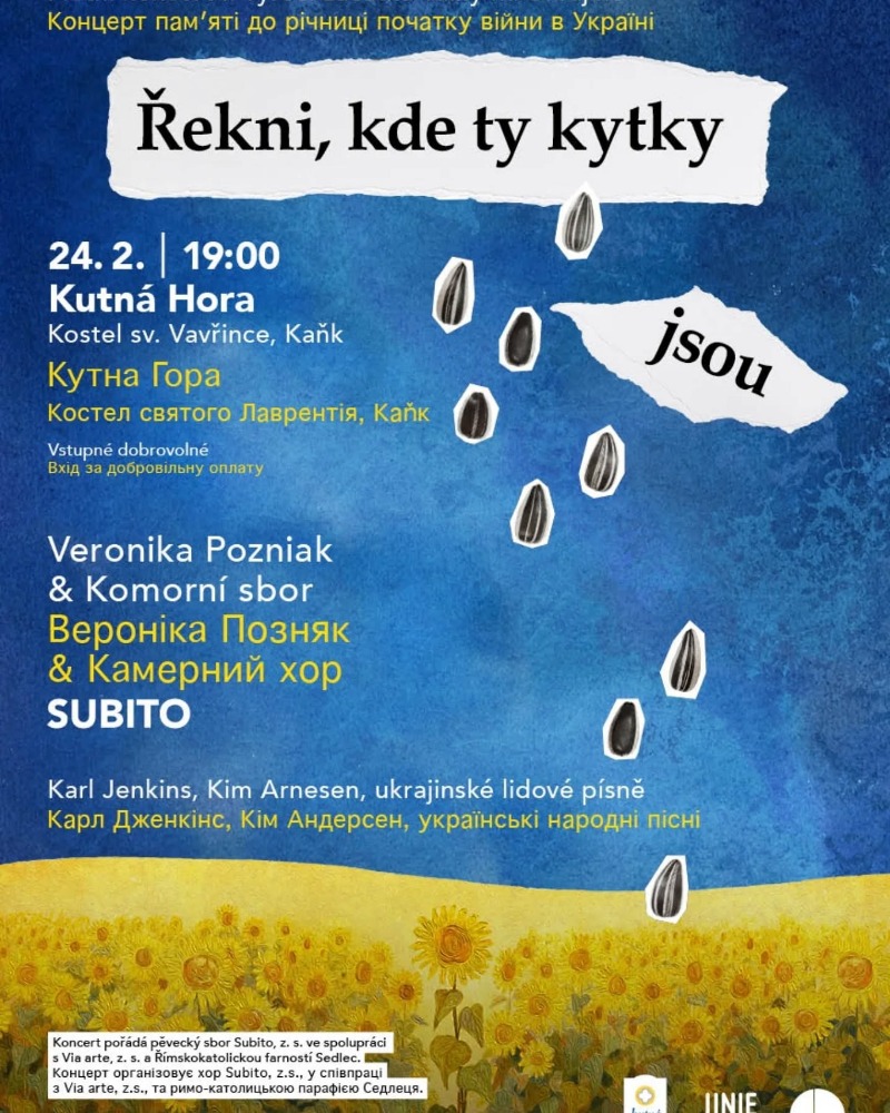 Tříleté výročí zahájení války na Ukrajině se stanem hlavním tématem kutnohorského koncertu, za nímž primárně stojí smíšený Komorní sbor Subito vedený Monikou Václovou a Michaelou Královou. Sedmnáct let fungující těleso se zaměřuje na sborovou tvorbu dvacátého století a kompozice současných českých i zahraničních skladatelů. V pondělí 24. února, v den výročí zahájení konfliktu, kutnohorskému publiku sbor představí program Řekni, kde ty kytky jsou. Jeho osu utvoří sedm částí rozsáhlé duchovní skladby sira Karla Jenkinse A Mass for Peace (Mše za mír), která byla poprvé uvedena v roce 2000 a která reflektuje dvacáté století jako dobu nejničivějších vojenských konfliktů v historii lidstva. Věnována byla obětem kosovského konfliktu.