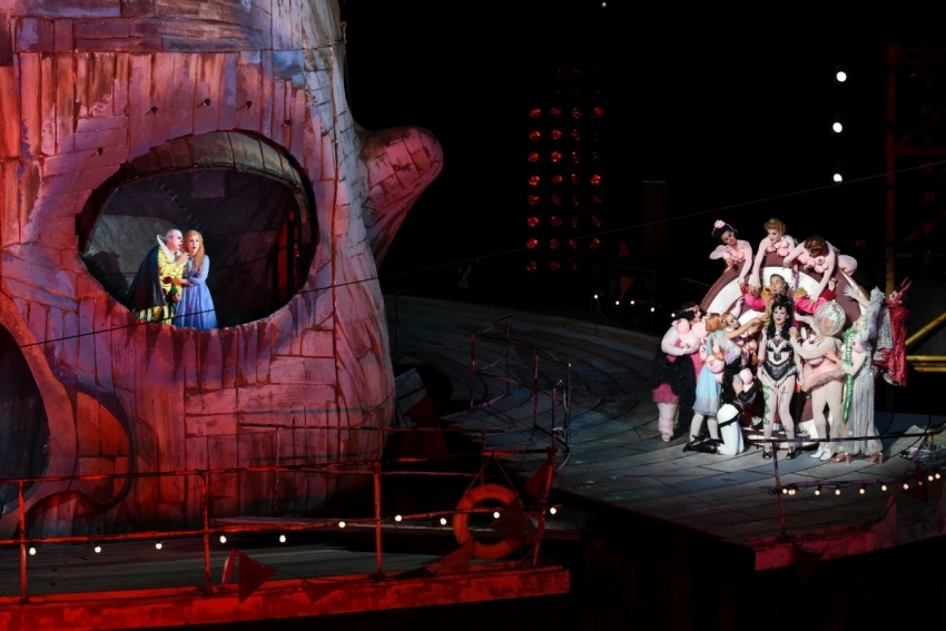 Rigoletta tento večer zpíval norský barytonista Yngve Søberg. A výborně. Výrazově postavu vystihl a předvedl potřebnou škálu emocí, od zlostného a poťouchlého, sarkastického cynika až po zlomeného otce. Měkce modulovaný hlas byl možná o něco světlejší ve výškách, než bývá u špičkových výkonů, ale nijak zásadně. Všeobecný problém s tenory se jemně promítl i tady. Měla jsem možnost slyšet v podstatě dva. Během zmíněného večera stráveného na břehu ztvárnil vévodu Rus Sergey Romanovsky, který pak druhý den zpíval tenorový part ve Verdiho Requiem (Reflexi si můžete přečíst zde.) Úplně neoslnil. Ani v neděli na dálku v Rigolettovi, kde byly patrné intonační nepřesnosti. V úterý vystoupil jako vévoda Bělorus Pavel Valuzhin. Vládl barvitým a sytým tenorem, hezky modulovanými frázemi i potřebnou šířkou. Přesto ve vypjatějších místech exponoval hlas nad tón a v jednom místě zaváhal výrazně – to je pro mě ale sporné, protože v tu chvíli jeho postava zpívá opět na temeni hlavy ve výšce několika desítek metrů, dokonce si během árie lehá do závěsného lůžka. Pokud tento úctyhodný kaskadérský výkon Valuzhin uzpíval byť s intonačním vybočením, patří mu i tak výrazné bravo. Pokud to byl figurant, ovšem vypadající k nepoznání a otevírající ústa, a pěvec byl v tu chvíli ukrytý kdesi v útrobách hlavy, i tak nelze onen moment kritizovat tak, jak by to bylo na místě na klasickém jevišti. Soudě podle fotodokumentace v bohatě vybaveném katalogu, konstrukce uvnitř je velmi členitá a zpívat zásadní tenorovou árii v takových podmínkách by nesvedl každý.