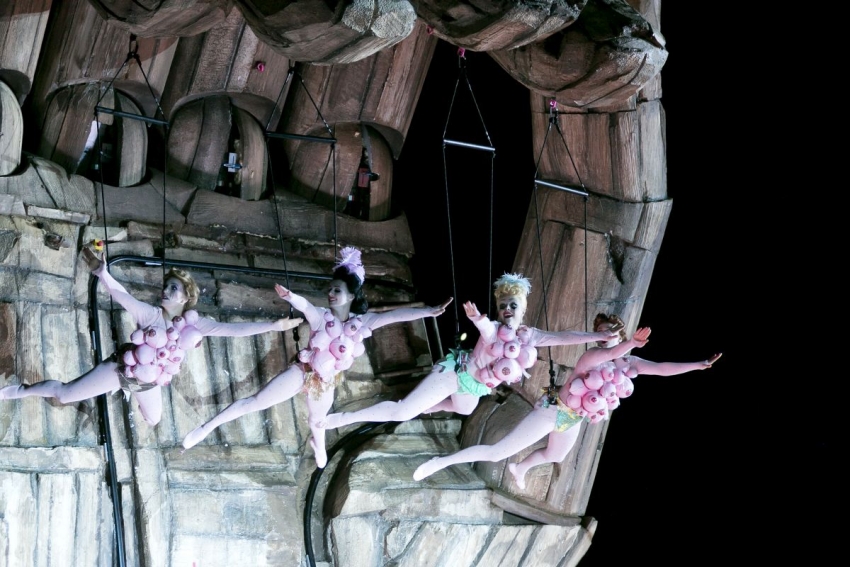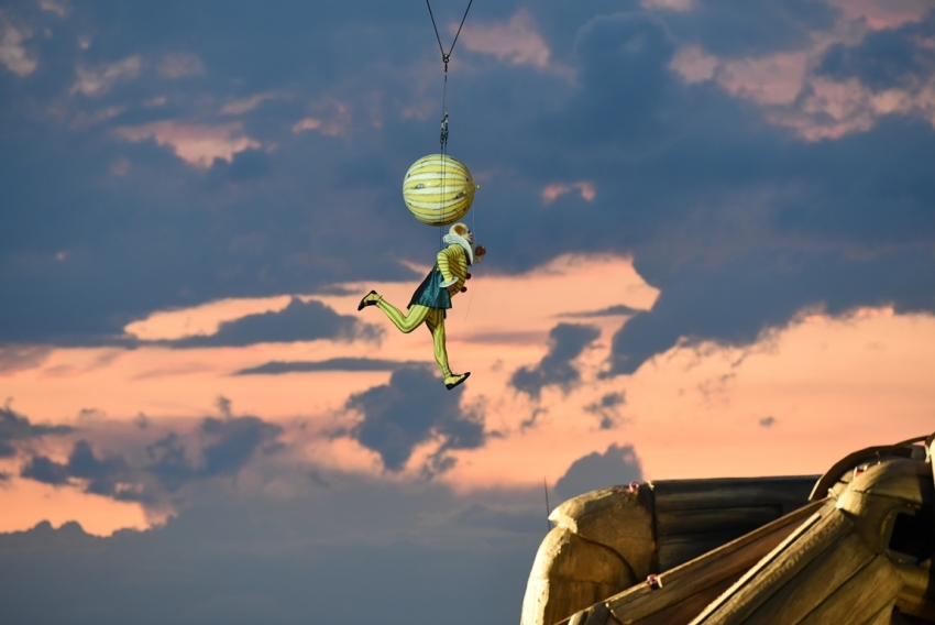 Lidé se ještě trousí a postupně obsazují obří auditorium čítající na sedm tisíc míst, když po manéži už pochoduje pouliční kapela. Artisté metají salta, na špici oné obří hlavy se otevírají padací dveře a v úctyhodné výši na ní začne poskakovat a vykřikovat klaun – vyvolává na všechny strany, stejně jako když začíná klasické cirkusové představení. Cílem ovšem je vyzvat publikum několika jazyky, aby si vyplo telefony, nefotilo a nenatáčelo. Číslo naprosto vtipné, nápadité s ohledem na svůj účel a hodno obdivu vzhledem k tomu, jaké kousky artista na oblém čele desítky metrů nad hladinou předváděl. A nebyla by to opera na vodní scéně, kdyby pár lidí neskončilo ve vodě. Napočítala jsem jich asi osm, první skončil „přes palubu“ hned při prvních tónech předehry, kdy mechanická ruka napřed vstřícně kynula jedné z cirkusových postav, jako by ji lákala, ovšem pak jedním nelítostným gestem naznačila, že se tady osud s nikým mazlit nebude.. a žbluňk!