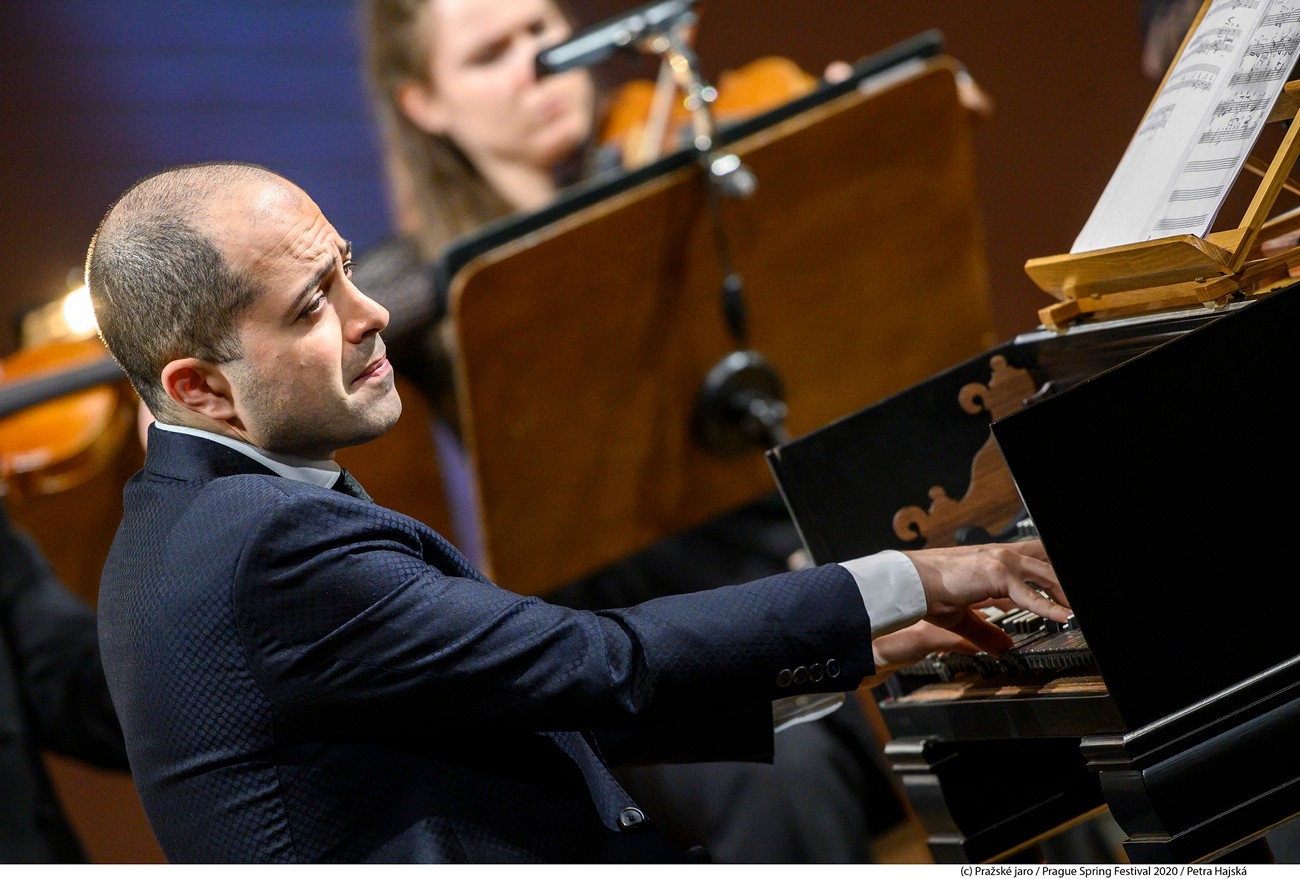 Následoval přesun zhruba o 200 let v čase nazpět a s Cembalovým koncertem f moll, W.C73 německého autora Johanna Christiana Bacha se na pódiu i na obrazovkách představil třetí důležitý článek večera. Cembalista, který se narodil v íránském Teheránu, mládí strávil ve Spojených státech, žil v Londýně a v současné chvíli se usadil v Praze, Mahan Esfahani, má za sebou řadu oceňovaných interpretací, a to jak na koncertních pódiích, tak v nahrávacích studiích. Člověk by možná ani nečekal, že cembalový interpret může být živel, Mahan Esfahani je toho však důkazem. Do Bachova koncertu se pustil s plným nasazením. Nadšení pro hudbu a nástroj, zkušenosti nabyté při studiu u Zuzany Růžičkové i jeho technická zdatnost mu umožňují nebrat si se skladbou servítky a promítnout do interpretace svůj temperament, což je u skladby koncertního charakteru naprosto žádoucí.