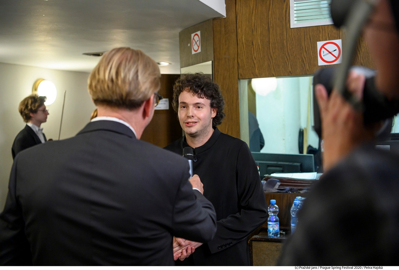 Večerem provázel pan Ondřej Havelka, stejně jako tomu je i u dalších koncertů letošního ročníku Pražského jara. Tentokrát se spolu s kamerou ukrýval v zákulisí bezprostředně před vstupem na pódium. Diváci tak mohli nahlédnout do míst, kde se umělci ještě v posledních chvílích soustředí na svůj výkon. V průběhu těchto soustředěných okamžiků si sólista i dirigent našli chvíli na krátké, ale zajímavé rozhovory. V jednom z nich dirigent například přiblížil okolnosti vzniku Simple Symphony britského autora Benjamina Brittena. Tato známá, poněkud méně závažná čtyřvětá kompozice z počátku 20. století zazněla na programu vzápětí.
