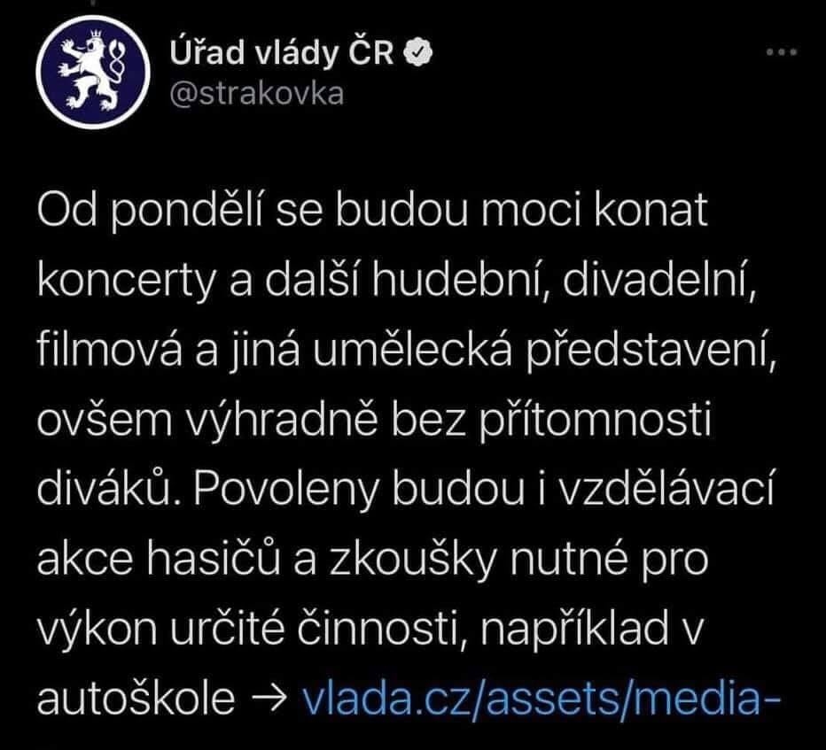 Pondělí přinese určitá rozvolnění i v kultuře, ovšem diváků se týkat nebude. Vláda povolila konání koncertů, divadelních, filmových a jiných hudebních nebo uměleckých představení, ale výhradně bez přítomnosti publika. Mezi odbornou veřejností už se na sociálních sítích ale začínají množit komentáře ve smyslu, zda toto opatření nemá mít za cíl jen to, aby umělci přišli o kompenzace. S největší pravděpodobností tím totiž padá takzvaná překážka pro individuální OSVČ bez DIČ, tedy umělecké profese, a tím i nárok na náhrady. Povoleny mají být i například vzdělávací akce hasičů a zkoušky nutné pro výkon určité činnosti, třeba autoškoly. Také se zkrátí doba zákazu pohybu lidí na veřejnosti, a to na interval od 23 hodin do 04.59 hodin druhého dne. Nově bude také možné konat svatby, pohřby nebo bohoslužby v počtu do dvaceti osob a zvýší se i limit pro shromažďování nepříbuzných osob, a to ze dvou na šest. Od pondělí vláda také umožní venkovní prodej vánočních stromků, kaprů a vánočních ozdob. Určitá rozvolnění postupně čekají i školství. Změny souvisejí to s tím, že vláda včera rozhodla o prodloužení nouzového stavu do 12. prosince, od pondělí ale zároveň potvrdila dílčí zmírnění některých opatření. Všechna dosud platná krizová opatření jinak zůstávají na základě vyhlášeného prodloužení nouzového stavu o další tři týdny dál v platnosti.
