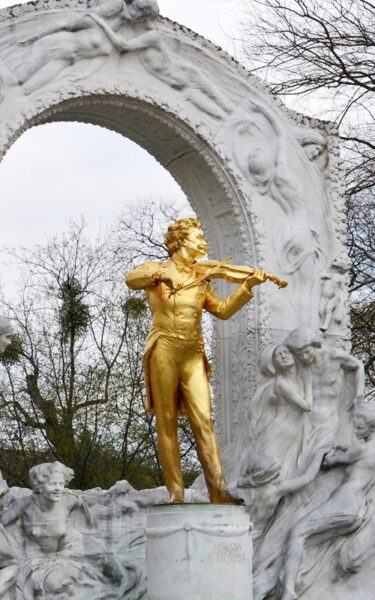 „Největší úspěchy vždy sklízel jeho ikonický valčík Na krásném modrém Dunaji z roku 1867, neoficiální rakouská národní hymna.“