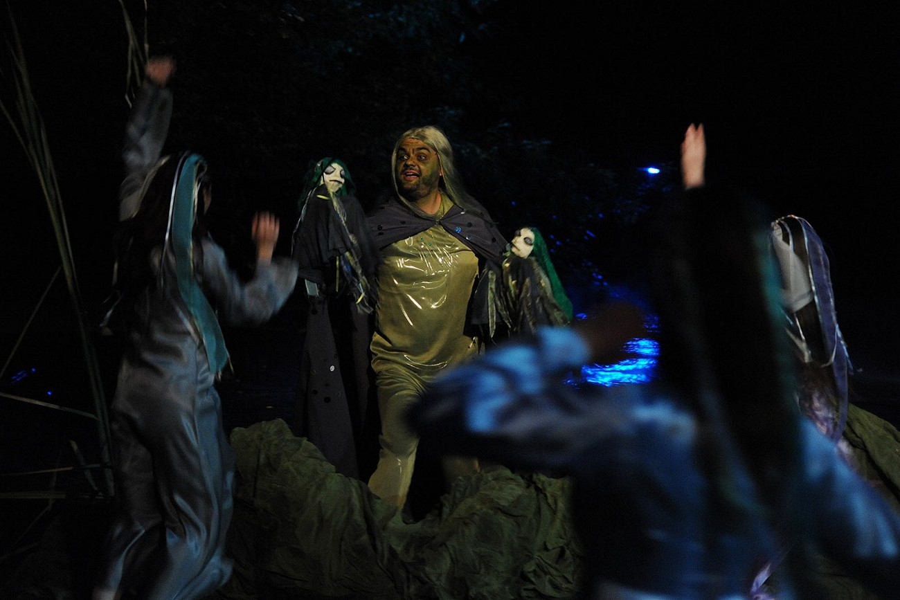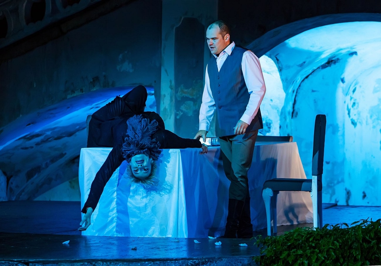 O Heřmanově inscenaci Rusalky v Českém Krumlově jsem již psal v minulosti. Hodnotil jsem pozitivně vynikající režii. Dokázala využít možností, jaké Český Krumlov skýtá. Pokud se ovšem tato inscenace přenese do jiného přírodního prostředí, chybí jí základní premisa – právě ono otáčivé hlediště, které je schopno se filmově situačně natáčet do řady různorodých scén opery. V Blatné není otáčivé hlediště, tudíž je vše vázáno na jeden pohled, odehrávající se na místě vedle orchestru, krytého dobře před nepřízní počasí. Proto byla režijní úprava režisérem Tomášem Studeným pojata nutně poloscénicky, což je pojem, avizovaný Jihočeským divadlem. Myslím, že příznačný. Vše se musí odehrávat na jednom místě, bez možností pružných „českokrumlovských“ proměn, vpravo vedle orchestru, aby pěvci i sbor měli nutný kontakt s dirigentem, který je vždy v opeře zásadní.