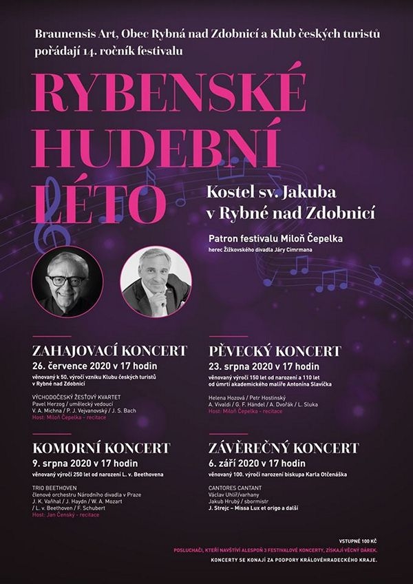I v letošním roce se přes všechny útrapy s pandemií koronaviru podařilo zorganizovat další ročník tradičního hudebního festivalu v Rybné nad Zdobnicí v Orlických horách. V pořadí 14. Rybenské hudební léto nabídne čtyři koncerty, kde připomenou mezinárodně uznávané osobnosti s přímou vazbou k regionu. První je na programu v neděli 26. července, další pak během srpna a první neděli v září.