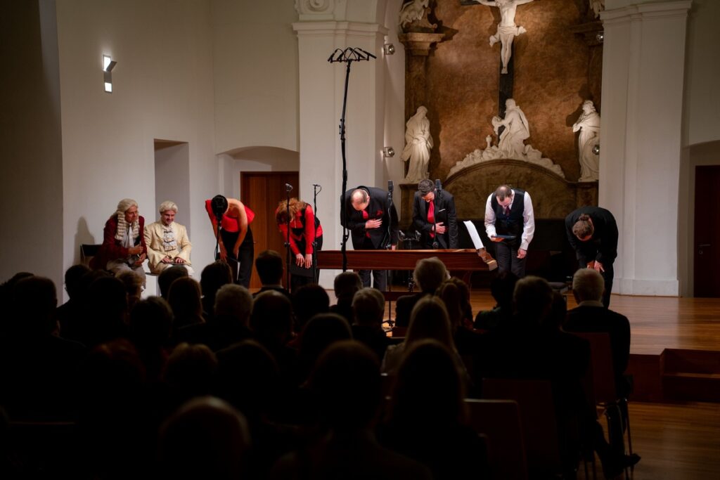 Již tradičně nemohl chybět Johann Sebastian Bach v podání Luďka Randára, ani Wolfgang Amadeus Mozart zosobněný Radovanem Králem. Johann Sebastian Bach tentokrát vstoupil na pódium rozladěn. „Jak můžete být rozladěn s tolika pěvci absolutního sluchu?“ podivil se Mozart. „Jak mohu být nerozladěn, když vidím zpívat v altu i sopránu ženy? Ještě že je tam aspoň jeden altista!“ Podivností bylo ještě víc, ale po první písni se oba zaposlouchali a začali italský text dokonce překládat.